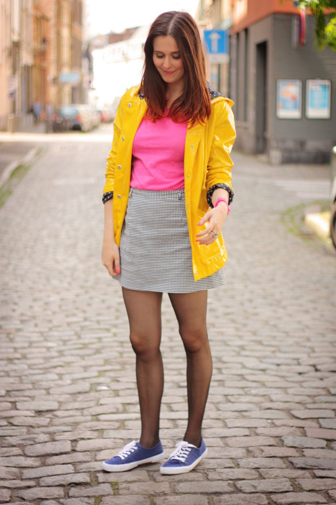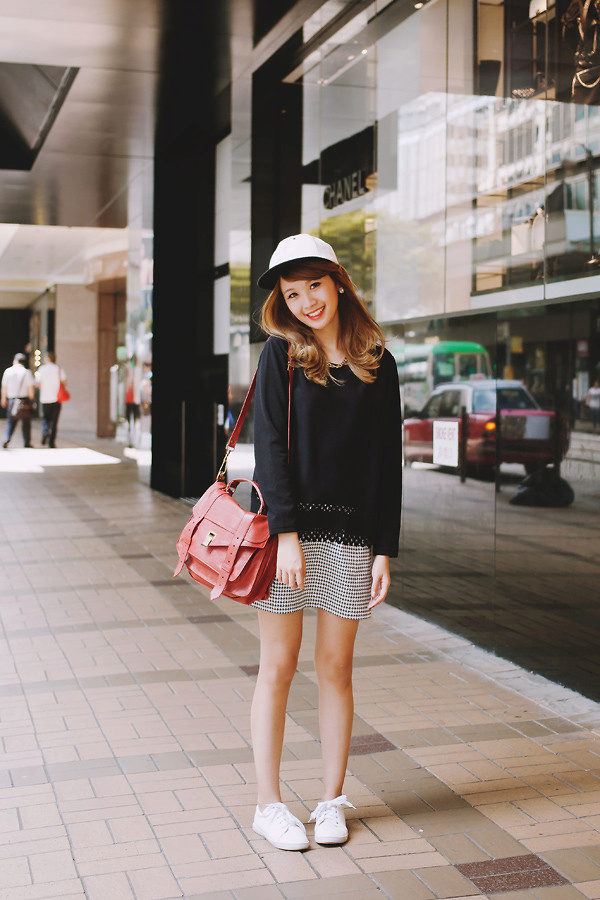 The sneakers are dark peach, almost brown in color with a white sole, a tonal jumper and a dark gray check skirt. Complements the kit a small brown cross-body bag.