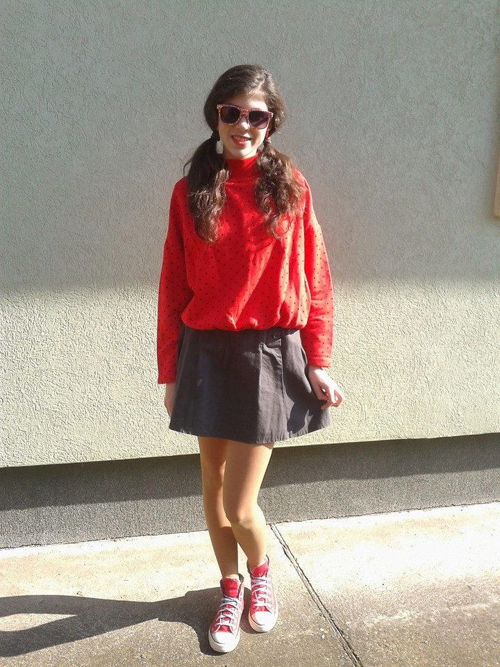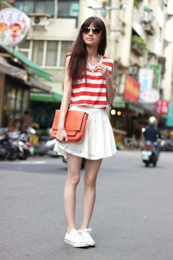 Black sneakers with white sole, white mini-skirt, black top and red urtka. Sunglasses in a black frame and a red bracelet complete the look.