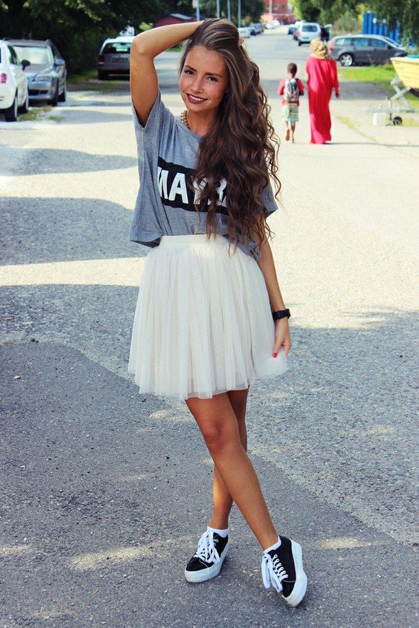 We bring to your attention a few of the most successful and beautiful images in different styles, in which the fashionable pair “sneakers + skirt” is taken as a basis.