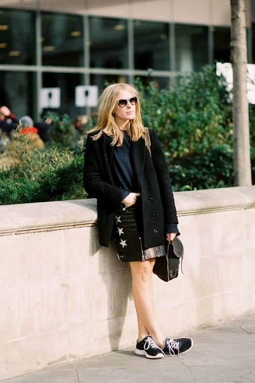 Black sneakers just will not go unnoticed, so you need to be able to beat them correctly. Now sports shoes with thick white soles are very relevant.Such sneakers will look spectacular as with a black leather jacket, and with a classic light raincoat.