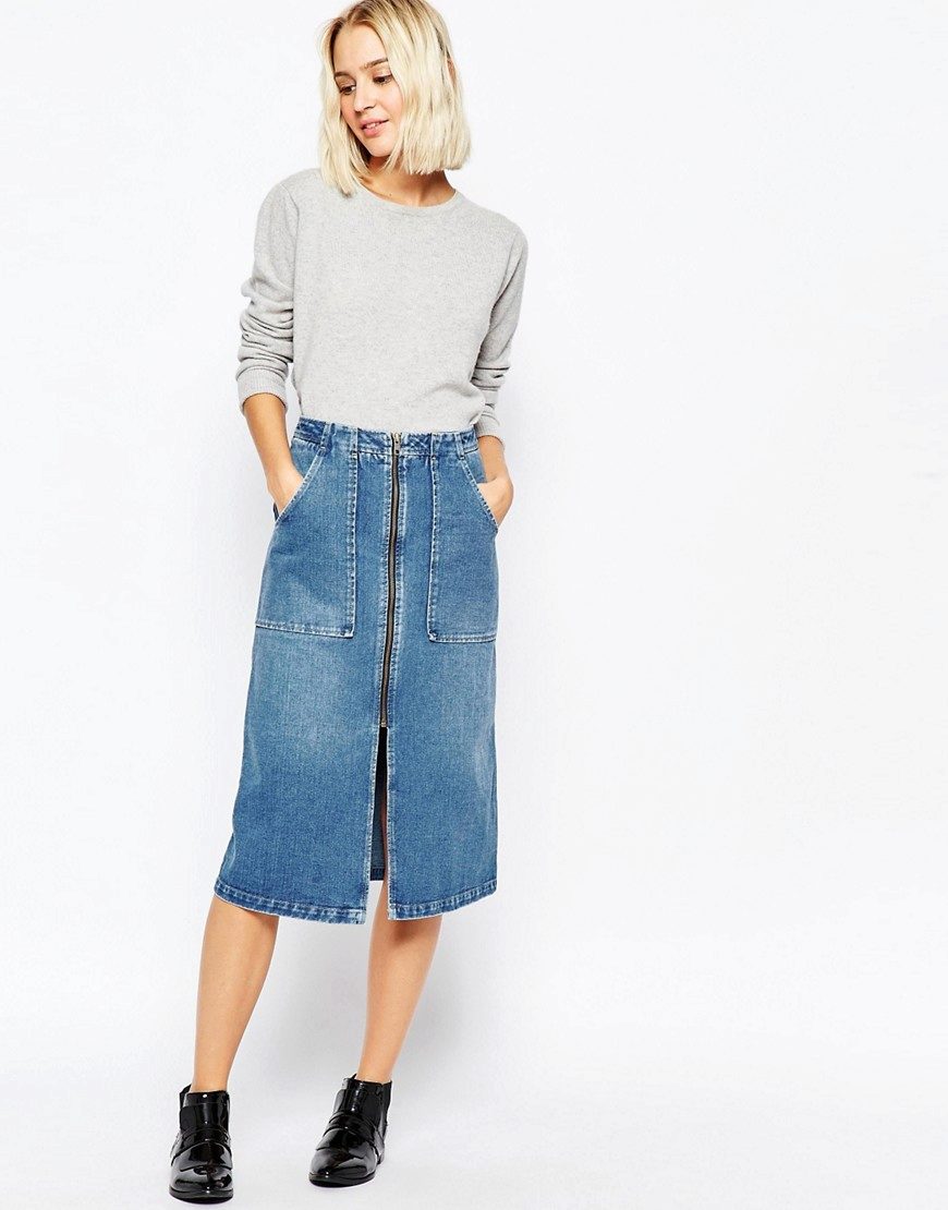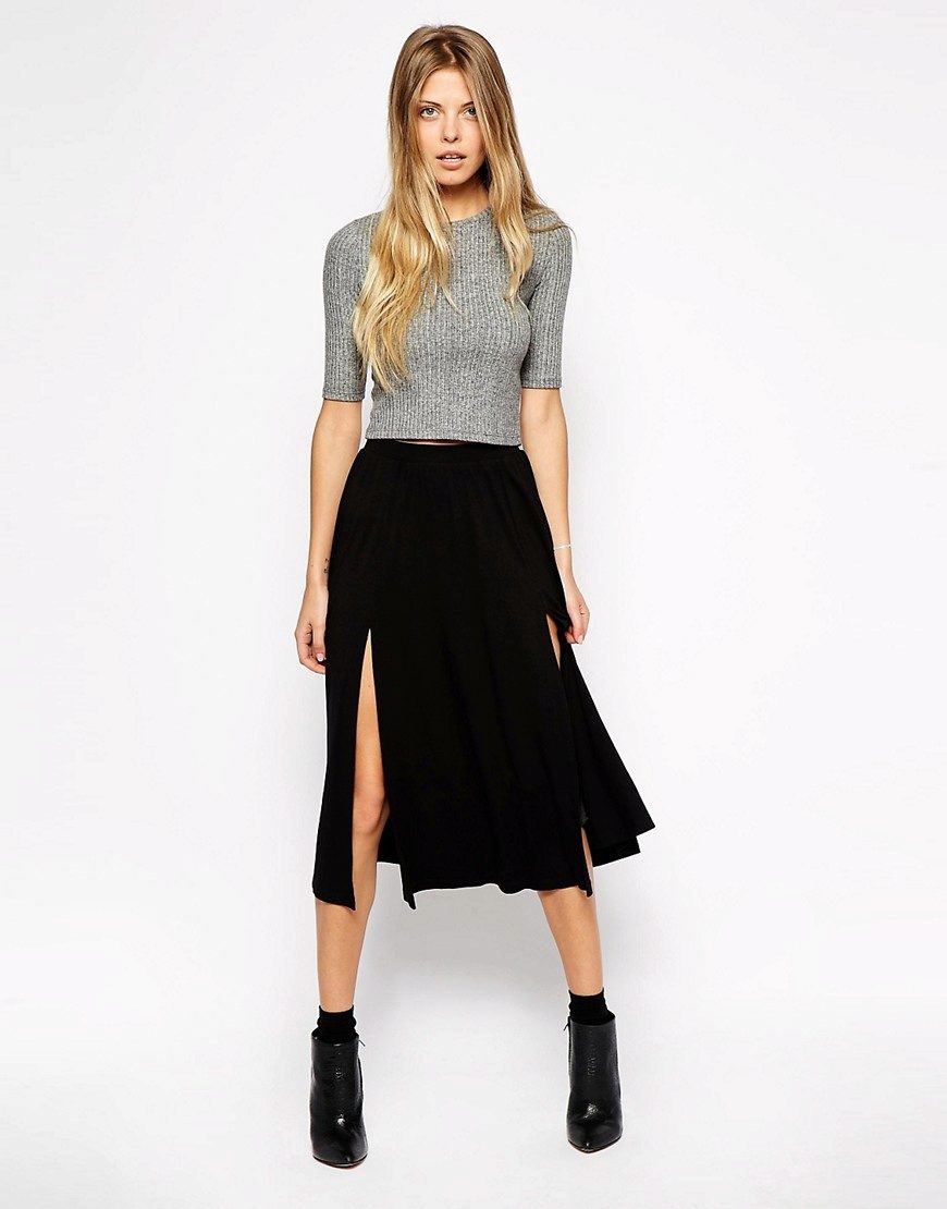 The skirt with a midline cut is perfect for the cold season. Such a model can be sewn from denser fabrics and combined with a warm sweater, jumper or turtleneck, and as shoes choose ankle boots or high-heeled boots.