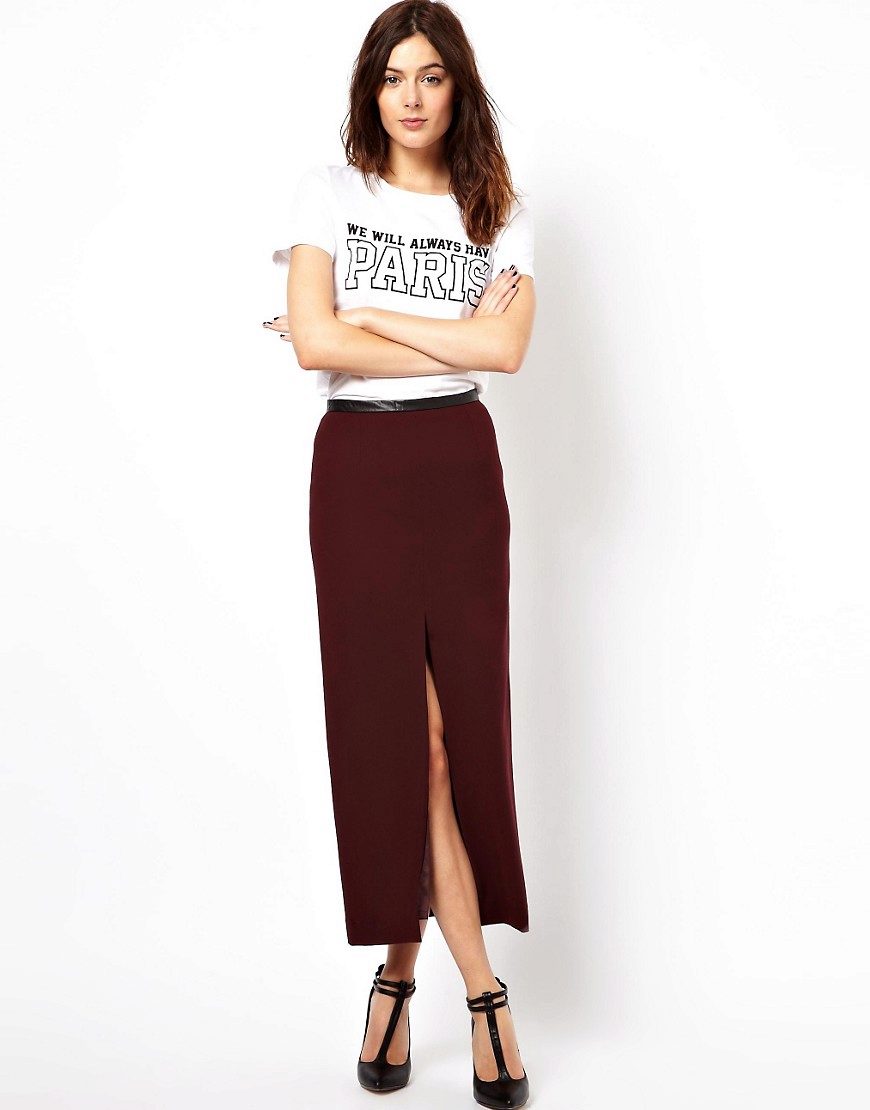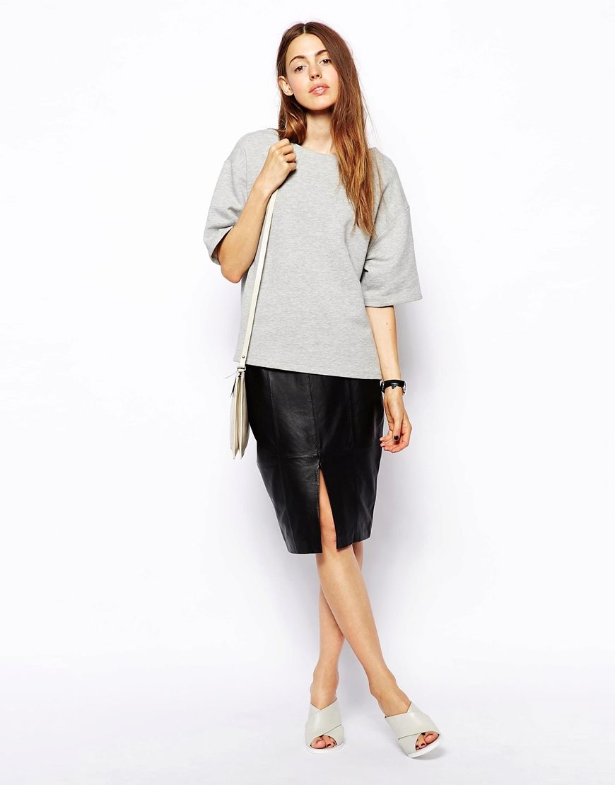 The cut looks good on a straight or trapezoidal model. A short leather skirt with a small slit is more of a youth version.A classic blouse will help soften the frank look. Medium length models are appropriate for the office, for example, a pencil skirt with a small slit on the side or back.