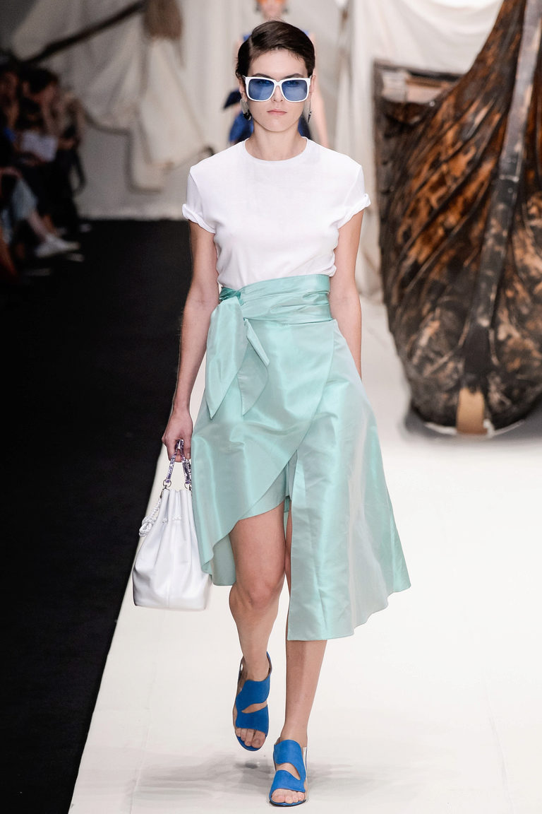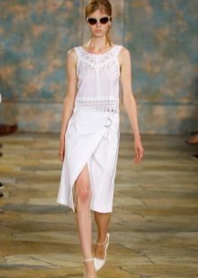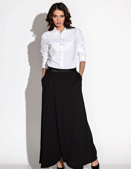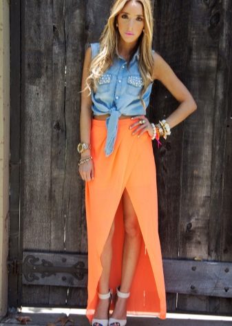 A wrap-up long skirt is also very relevant for the summer season. It can be flared or straight. An interesting option in the crease. Most often for them, designers choose one color, focusing only on the bright accessories and the original combination with the top. To add an image of sexuality will help a long cut, exposing the legs to the thigh.