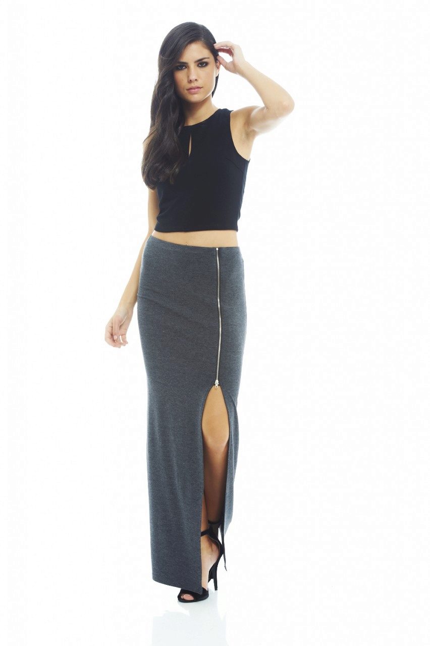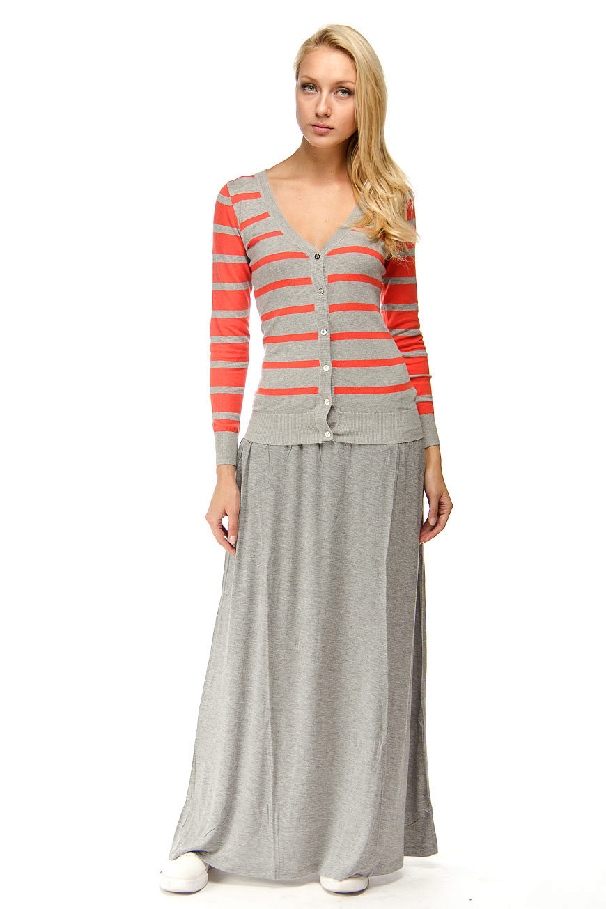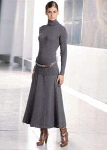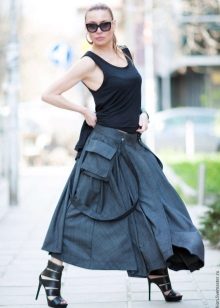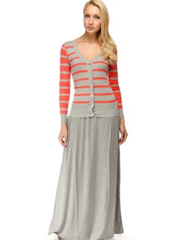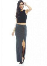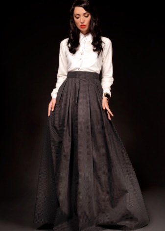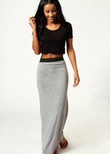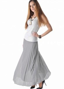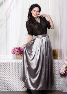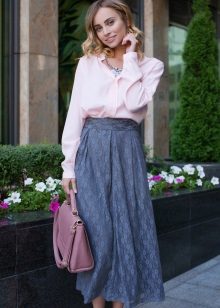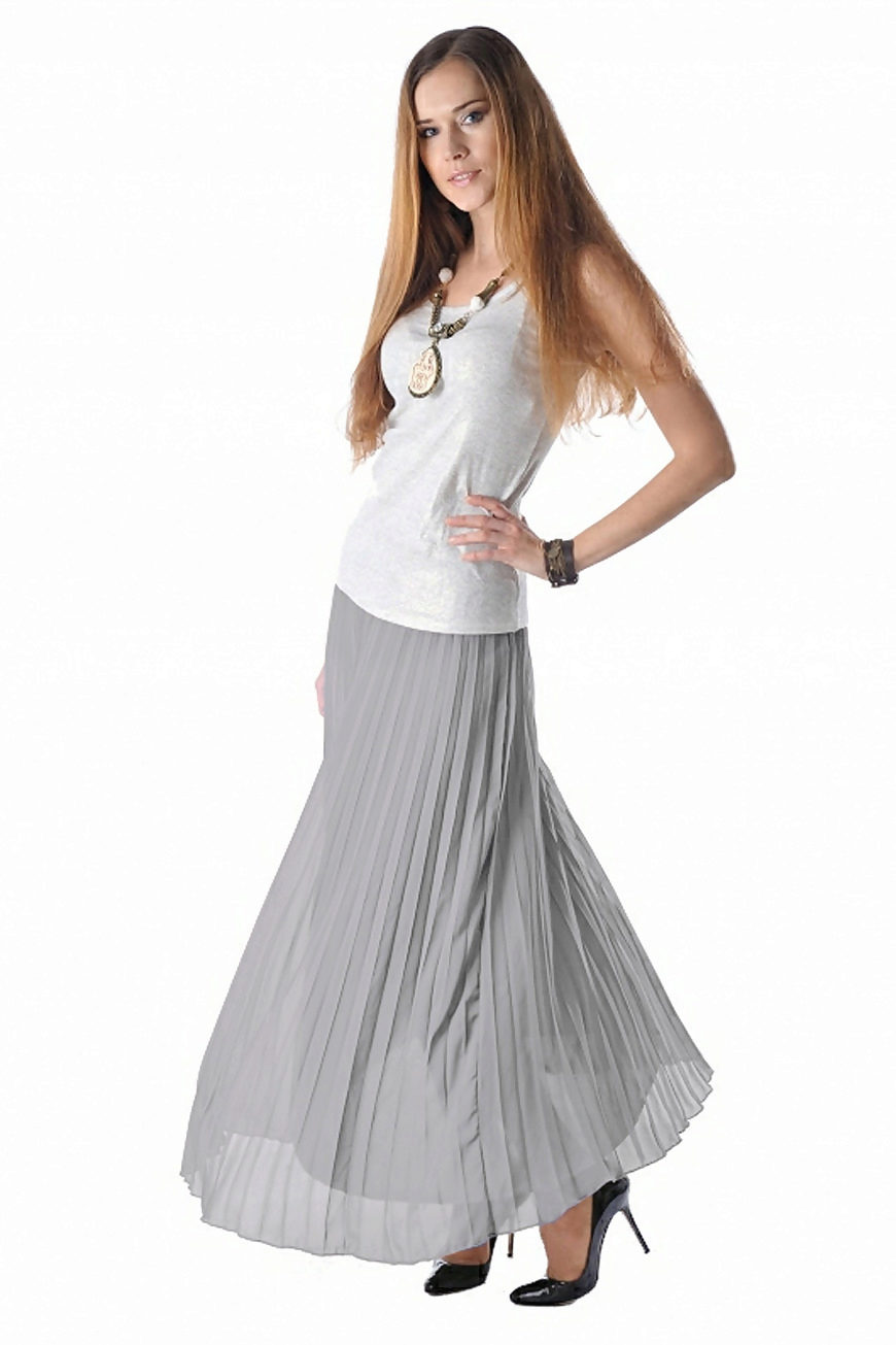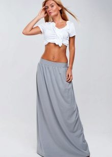A gray long skirt is a great choice for a casual wardrobe. Many women of fashion prefer to wear a chiffon skirt with a top or a t-shirt decorated with an original pattern. A leather jacket is an addition to the image. Many girls choose a gray long skirt from dense materials for every day.