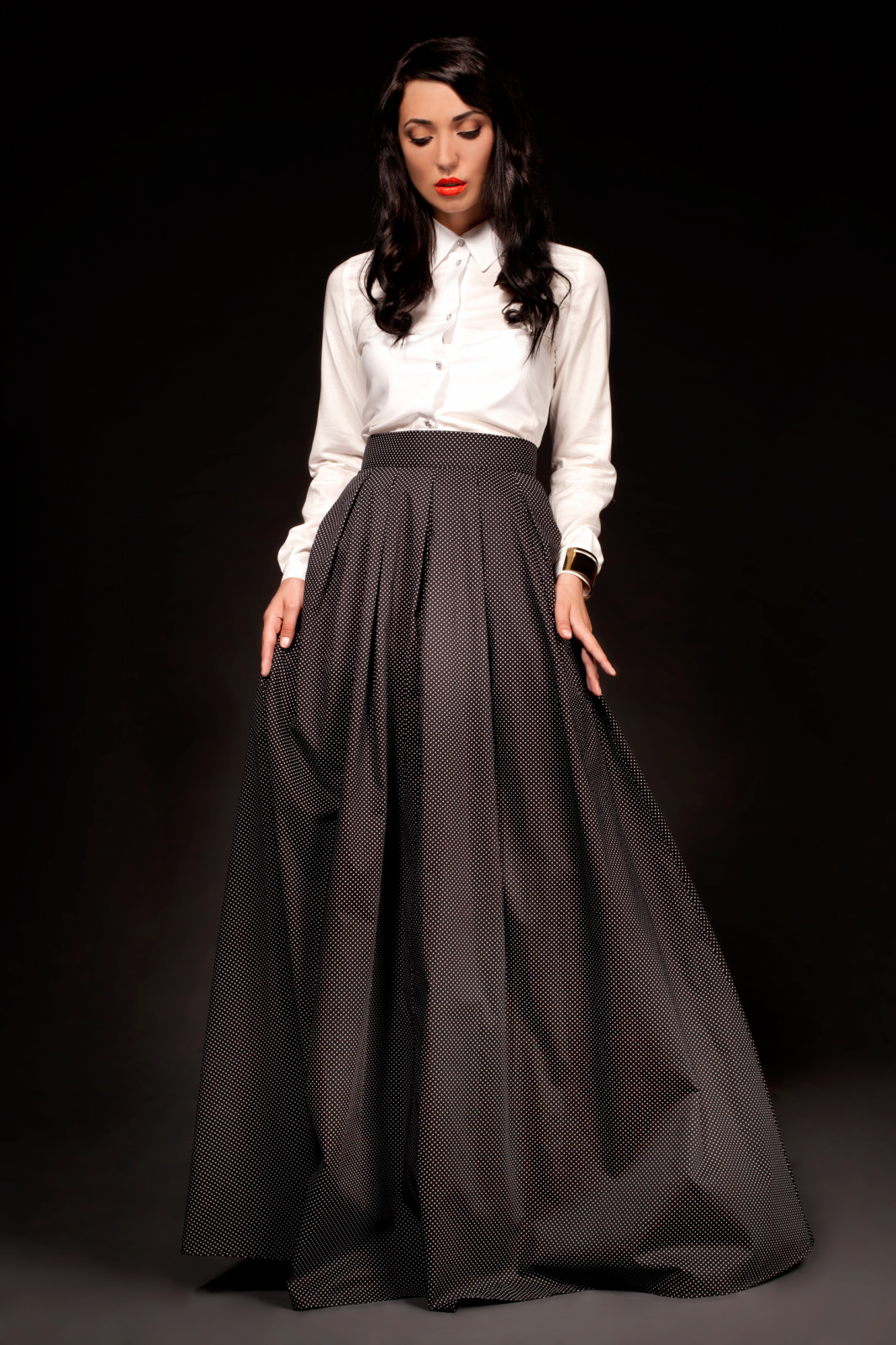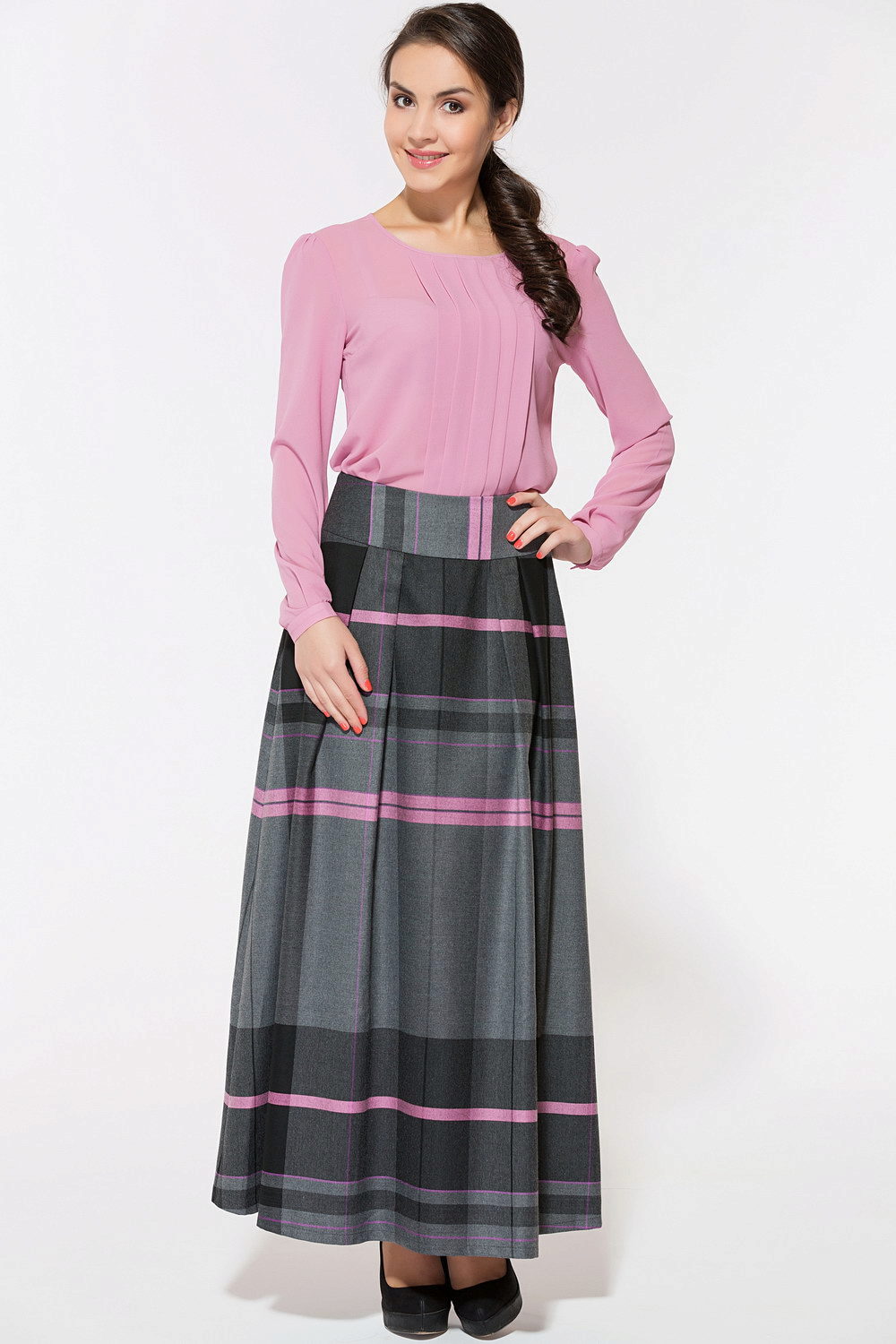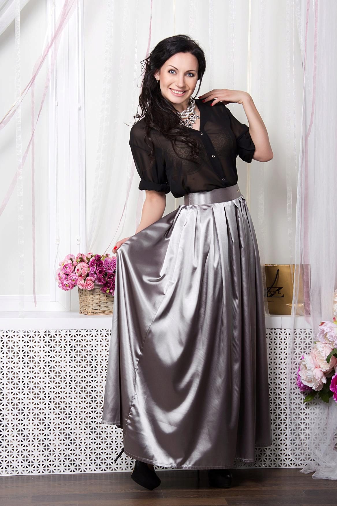 A gray long skirt is a great choice for a casual wardrobe. Many women of fashion prefer to wear a chiffon skirt with a top or a t-shirt decorated with an original pattern. A leather jacket is an addition to the image. Many girls choose a gray long skirt from dense materials for every day.