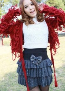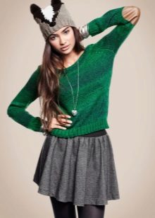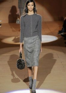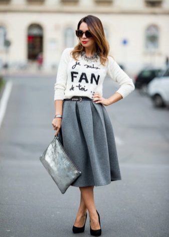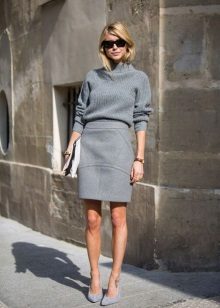 In the cool season with a skirt often wear a sweater or sweater. This tandem looks stylish and beautiful. Gray skirt perfectly combines with different styles of jackets, because it is only the background, which can be decorated with bright colors. If you wear a skirt and a gray sweater, then the emphasis should be on accessories or shoes.