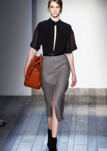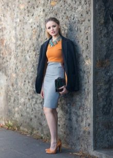 It is necessary to abandon the decor, decorate the silhouette will help luxurious expensive jewelry. Beautifully looks light gray skirt with a dark gray blouse to create an office image. To add color, you can take a bright handbag.