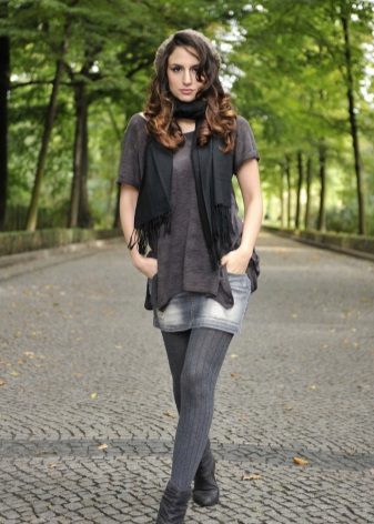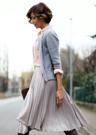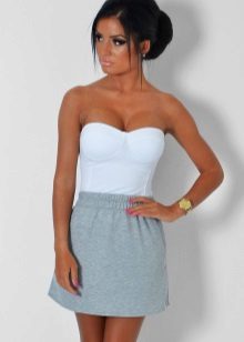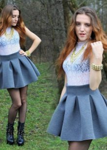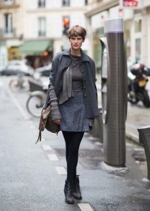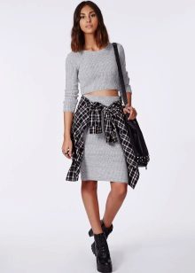 For a mini length skirt, it is worth picking up seductive blouses and tops. An excellent addition will be a knitted cardigan of their fine yarn. You can choose the top of silk or lace. Light gray tones will look beautiful with a gray skirt.