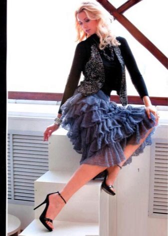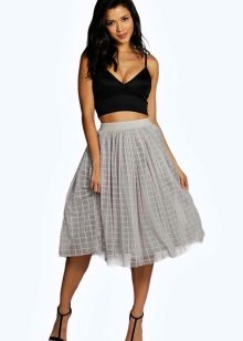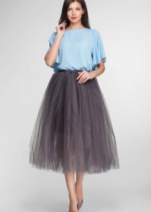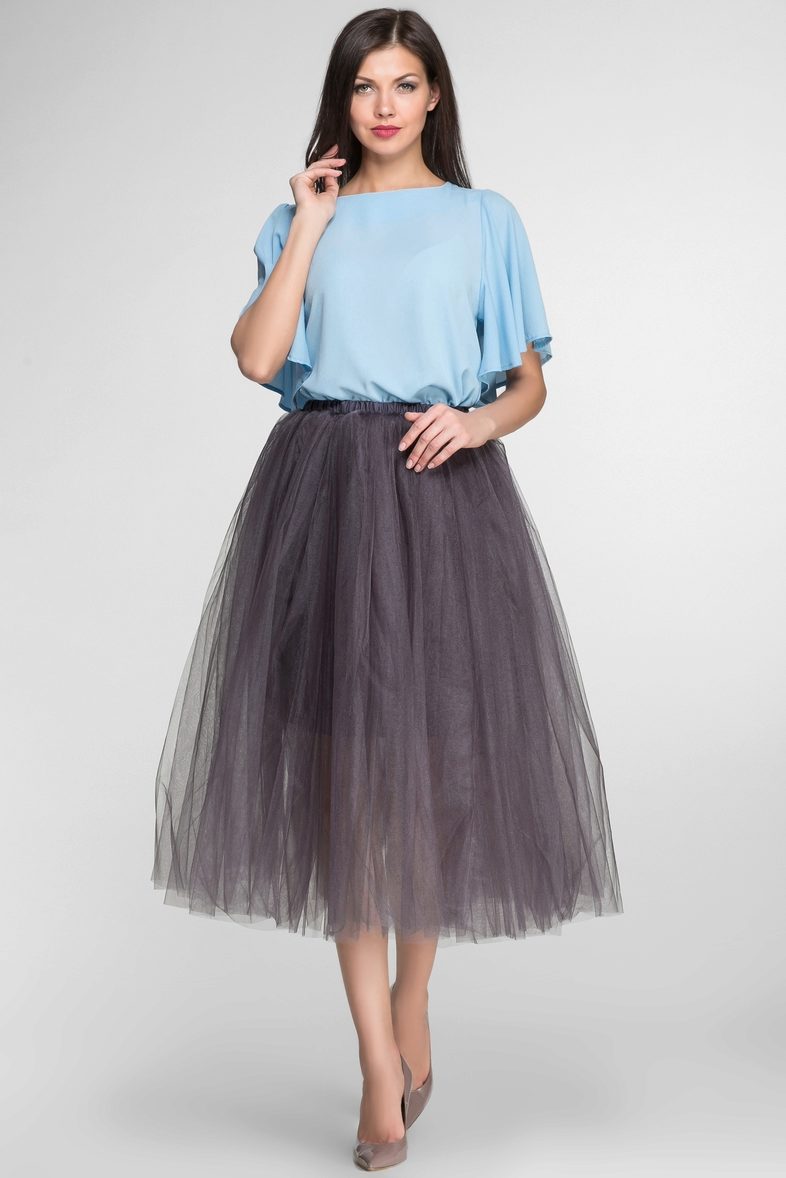 For the embodiment of the romantic bow is to give preference to a gray fluffy skirt to the knee. She perfectly harmonizes with feminine blouses.