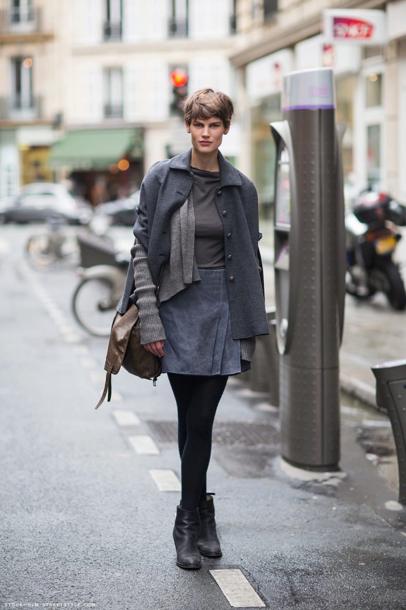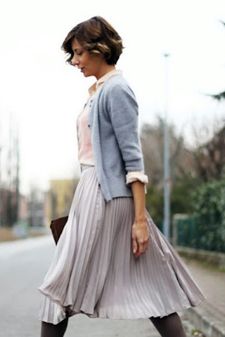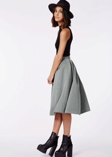 Fans of vintage style can look at a gray wool skirt with a small scarf. It is an excellent basis for the embodiment of interesting images. An ideal addition would be an elongated cardigan or a short jacket. For authenticity, you can wear a fashionable beret on your head.