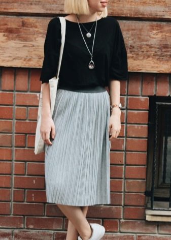 Gray skirt blends beautifully with a white blouse. Tenderness and romance is felt at first sight. To embody a business look, you can wear a black sweater or blouse with a gray skirt. Jewelry on the neck will be a bright accent.