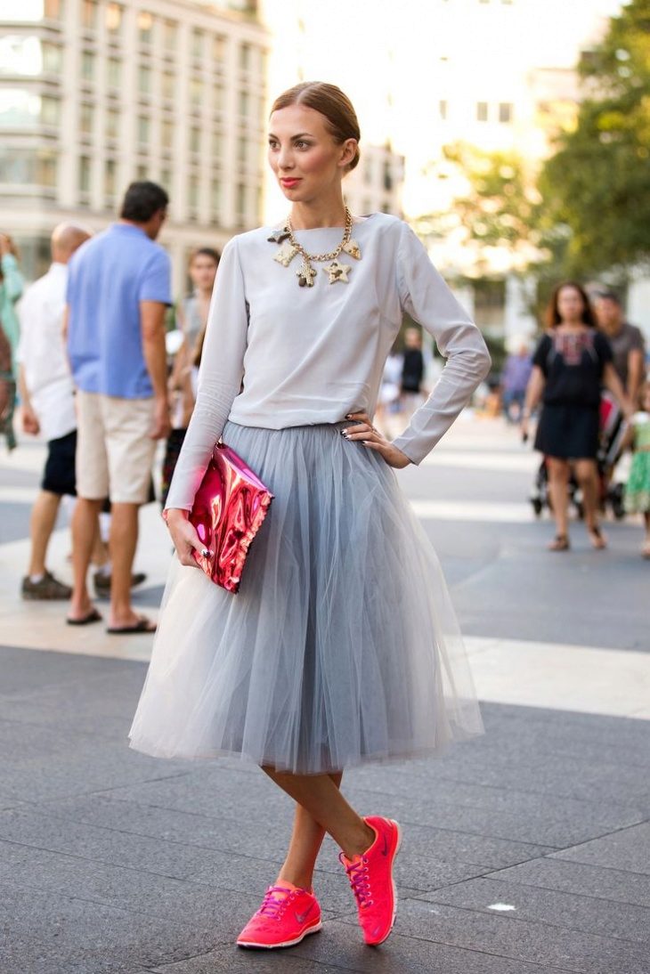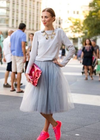 A gray sports skirt is perfect for everyday wear. Sneakers or sneakers can be worn, although shoes with heels look unique.