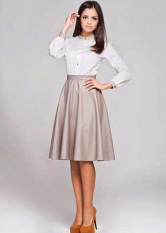 Gray skirts with a length slightly below the knee are often associated with pencil skirts, which are mostly dominant in business style. With a straight cut skirt, a classic blouse or a shirt of light colors will look beautiful.