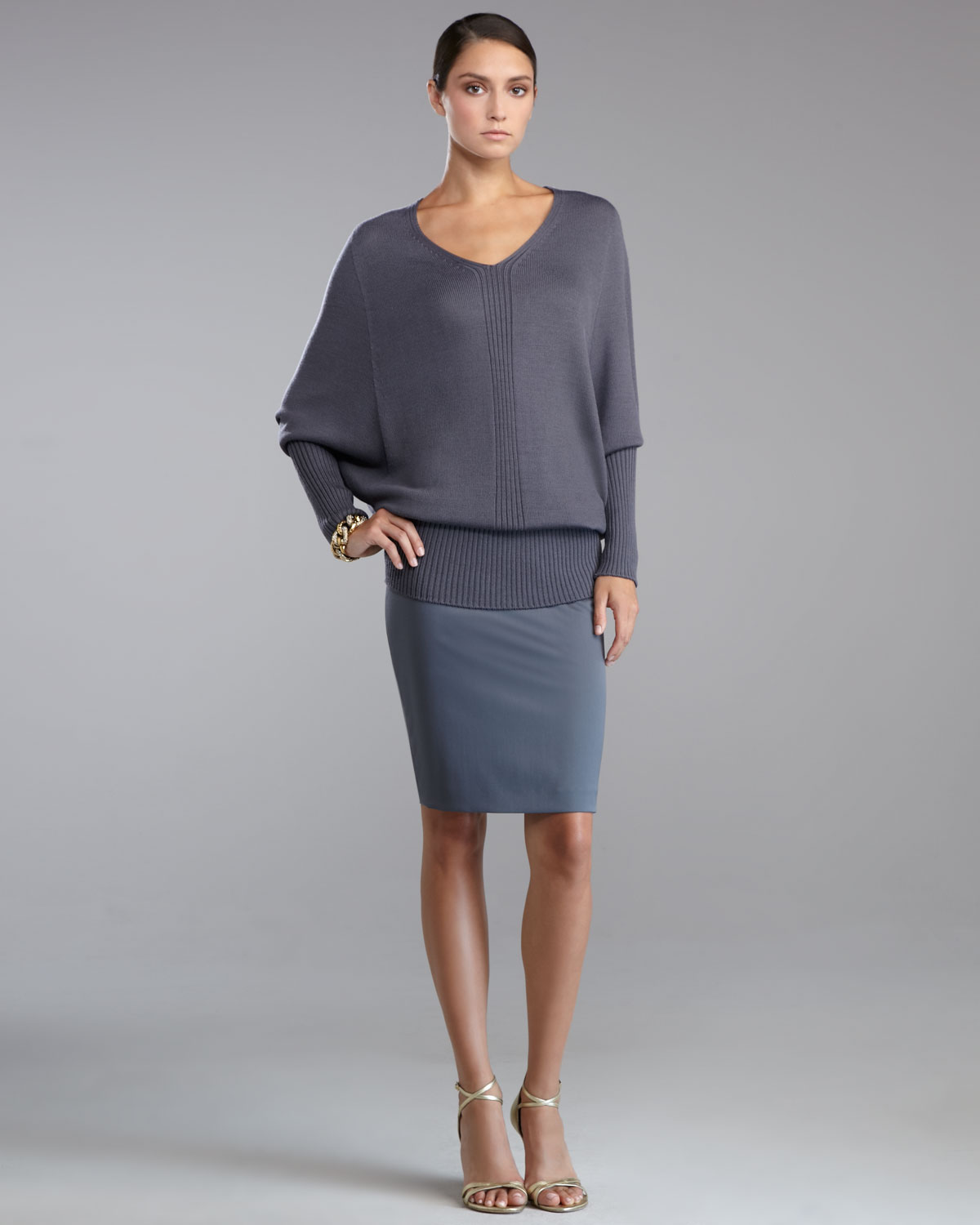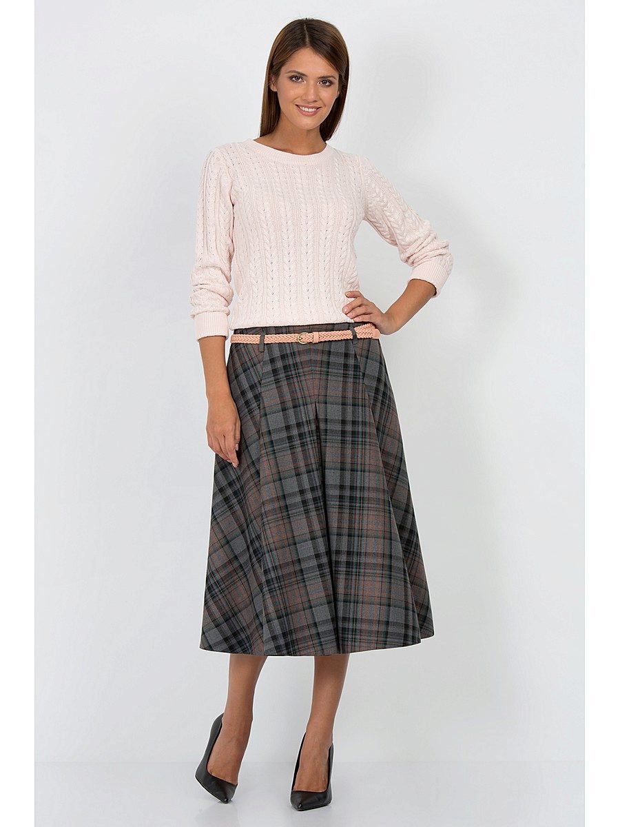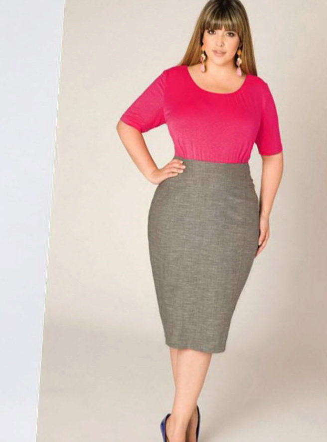 Gray skirt is an irreplaceable thing in the wardrobe of a full girl or a pear type owner. It helps to divert attention from full thighs.