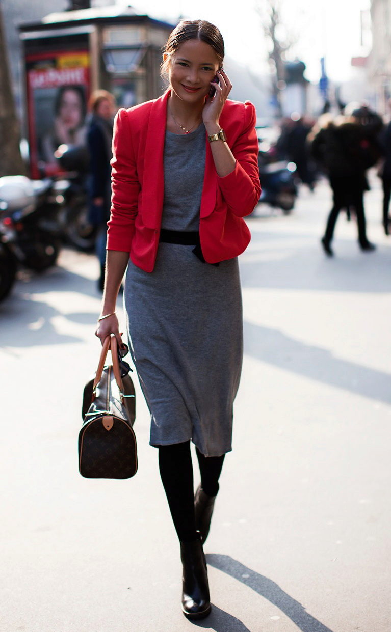 Do not limit your choices. You can wear the top of your favorite color with a gray skirt.Green, red, coral, crimson, blue blouse or sweater will help to show individuality. A gentle combination of gray and blue, which is so often present in nature, can be transferred to clothing.