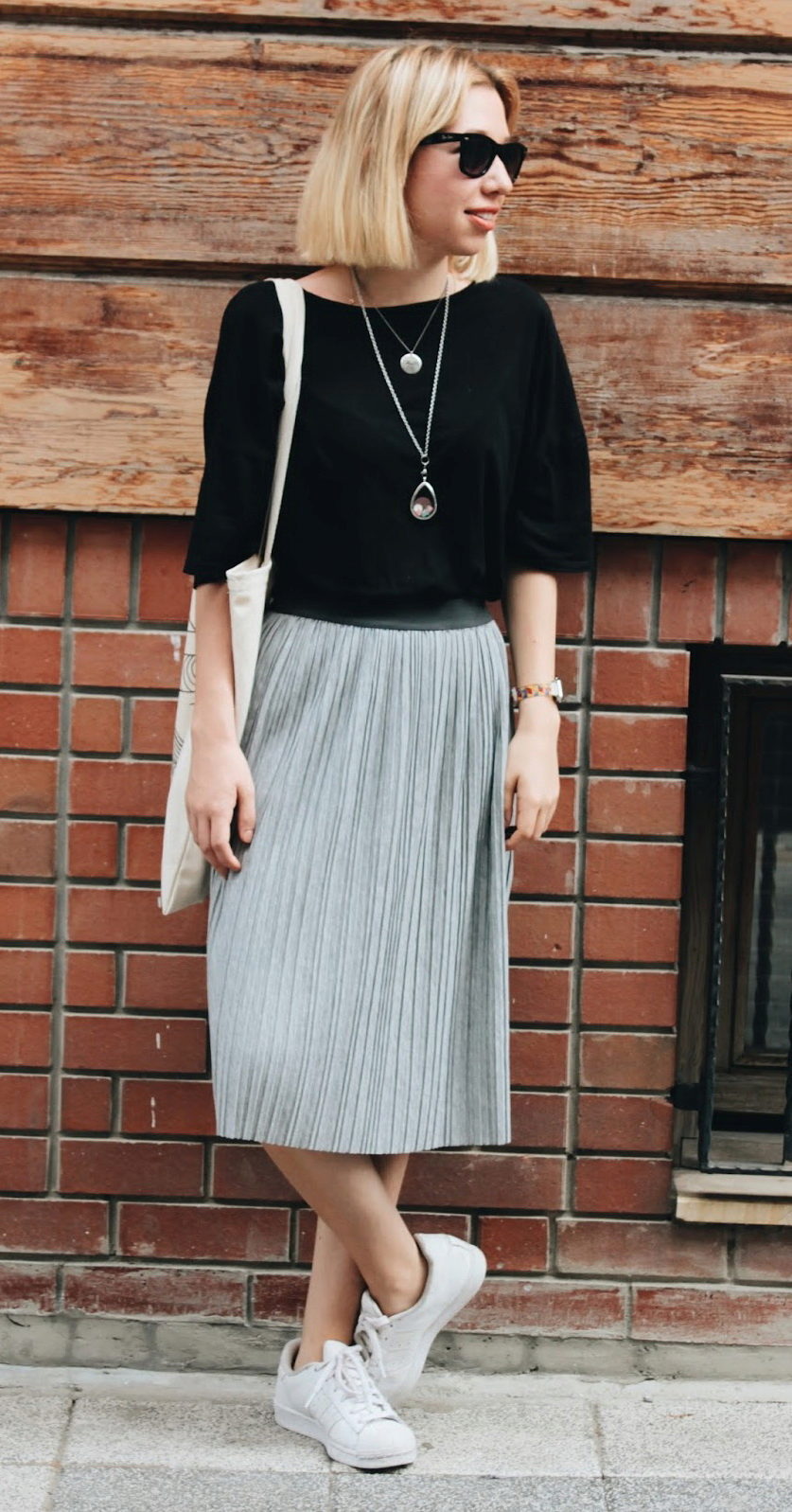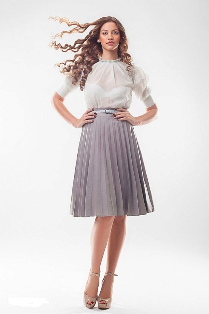 Gray pleated skirt looks great with a fitted top. In the cold season it is worth paying attention to a short leather jacket. In this outfit you will always be at your best in any circumstances.