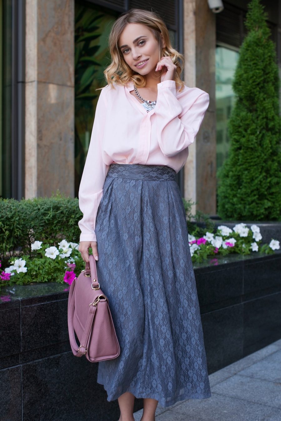 To match the dress code and show your personality, with a gray midi length skirt you can wear the top of bright colors and decorate the silhouette with luxurious bows.