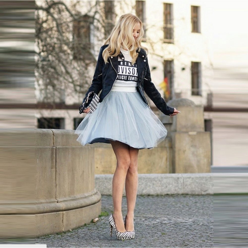 Gray color is universal, therefore it harmoniously looks with any shade or color. You can even use bright or acidic solutions. A gray skirt will help create a harmonious look.