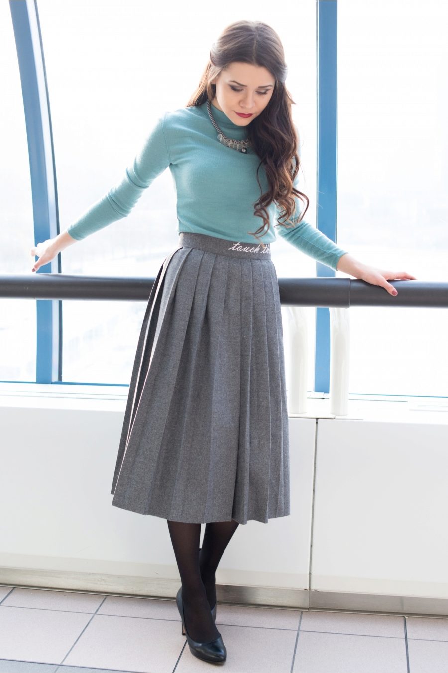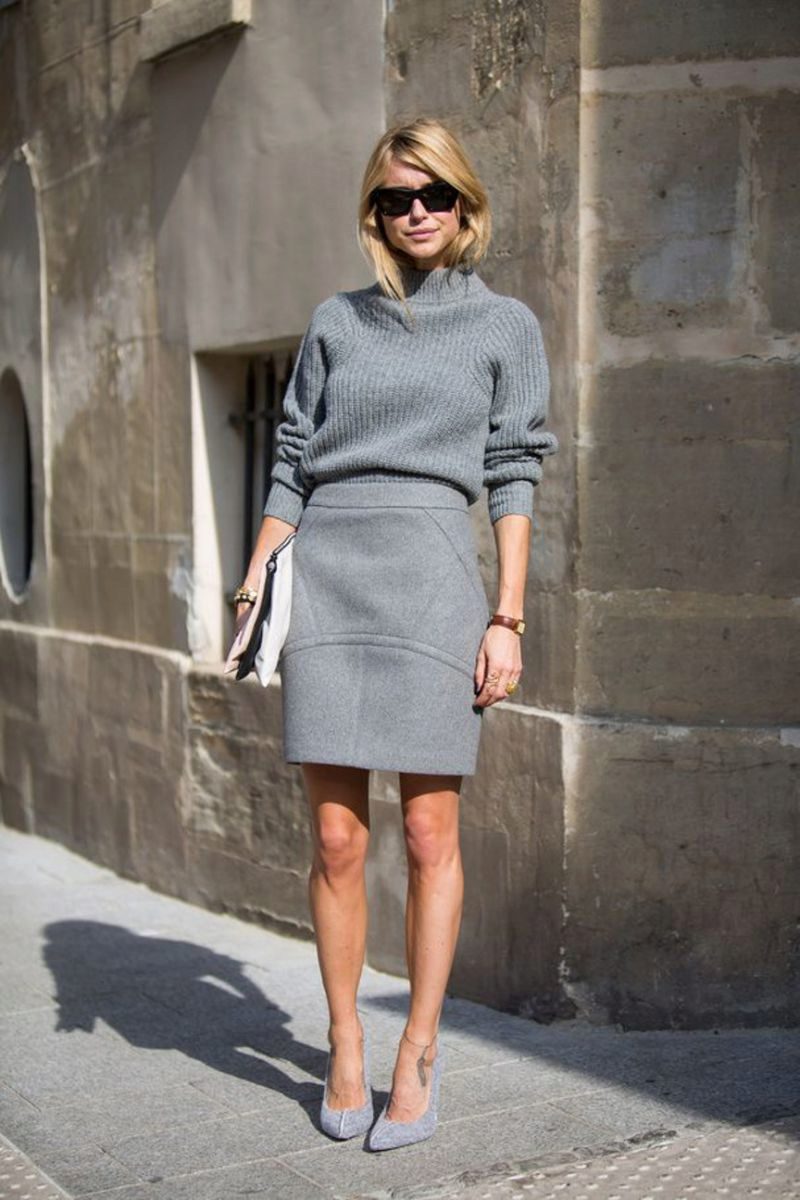 You can choose the top of any color to a gray skirt, and your look will look luxurious. The bright and acid colors of blouses or sweaters will be smoothed by the gray tone of the skirt.