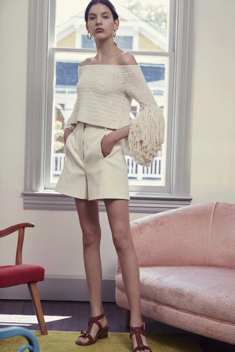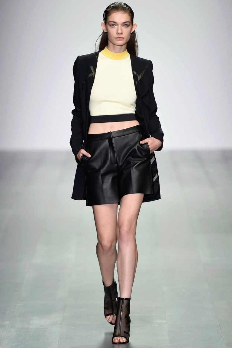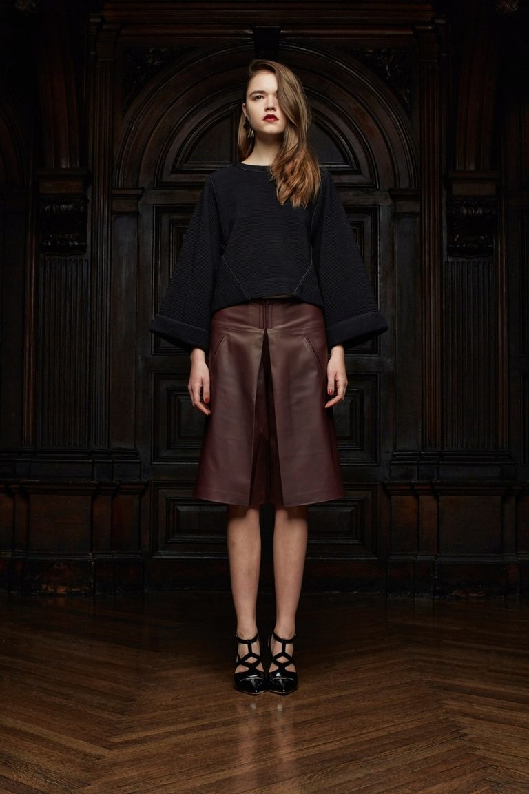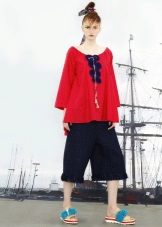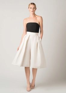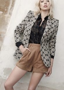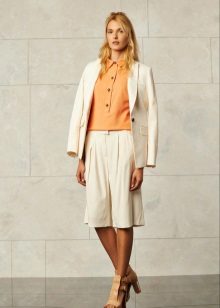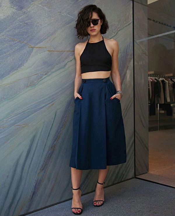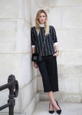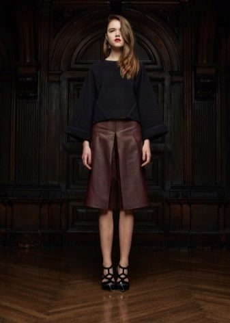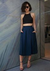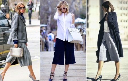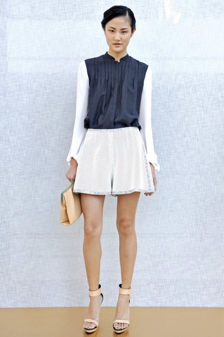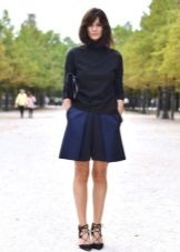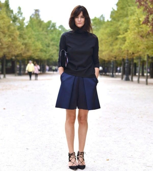 If the skirt-shorts are part of an office suit, then the top should be appropriate - a fitted jacket, a turtleneck of neutral tones, a classic blouse or a strict shirt.
