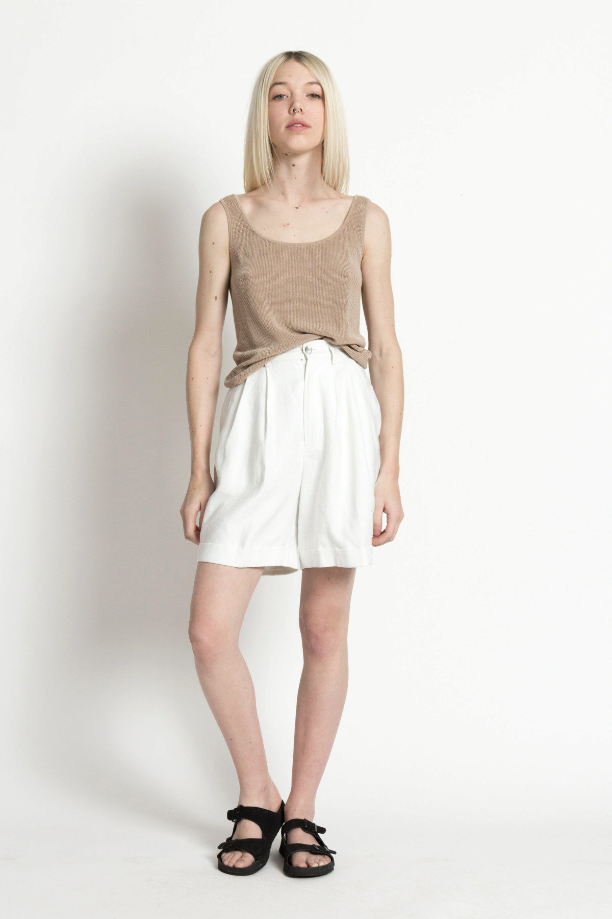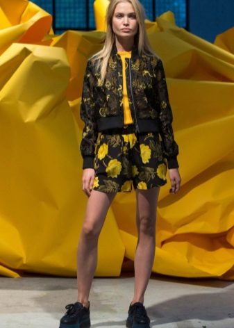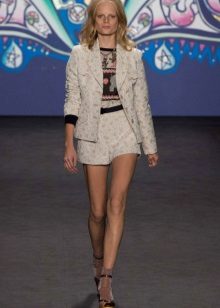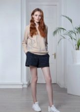 Shorts, sewn from a dense costume fabric, perfectly combined with a vest of the same color. Shoes - shoes with heels, ankle boots, boots.