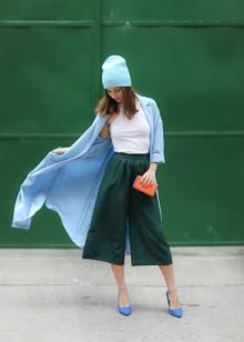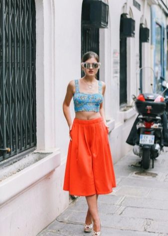 In the morning and evening, you can add a knitted cardigan or a summer blouse to this set. And, of course, the basic rule is that to a colorful bottom it is best to select a solid top and vice versa.