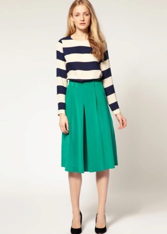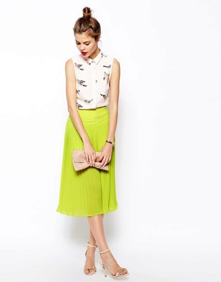 A skirt made of beautiful, flowing fabric is perfect for creating an evening look. In this case, it is suitable light, elegant top or blouse made of thin, transparent or shiny material. Graceful sandals or high heeled shoes will complete the look.