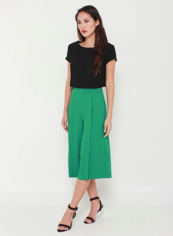 Pleated skirt-shorts in pale green with a cream, peach and pale pink blouse are a great alternative to the traditional office suit.