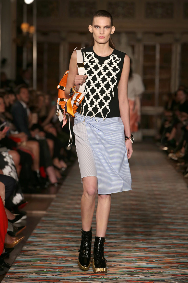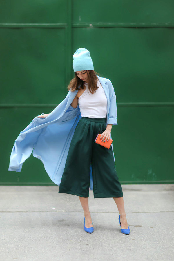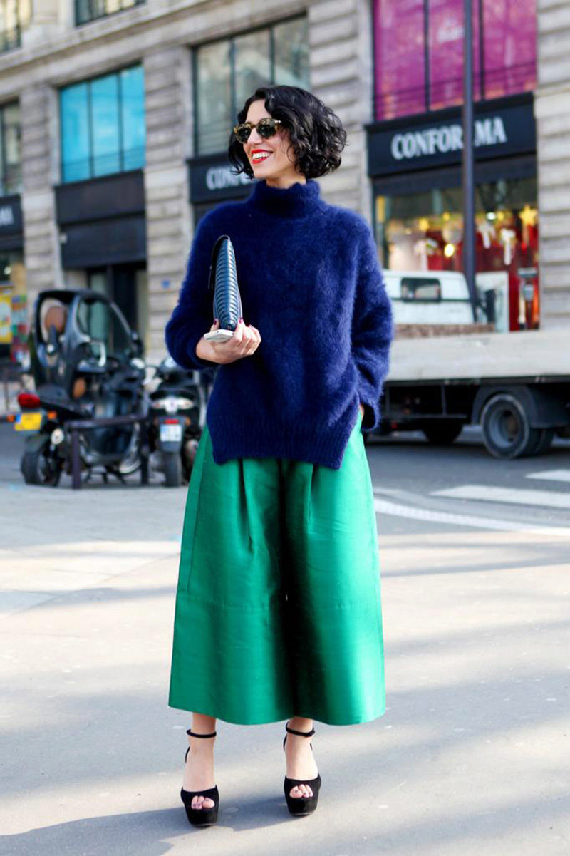 This season are relevant any combination of blue. It can be a school blue skirt-shorts and a white blouse, an inky blue pencil skirt and a monochromatic turtleneck, a denim blue skirt and a bright T-shirt.