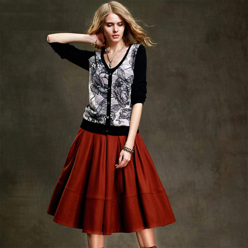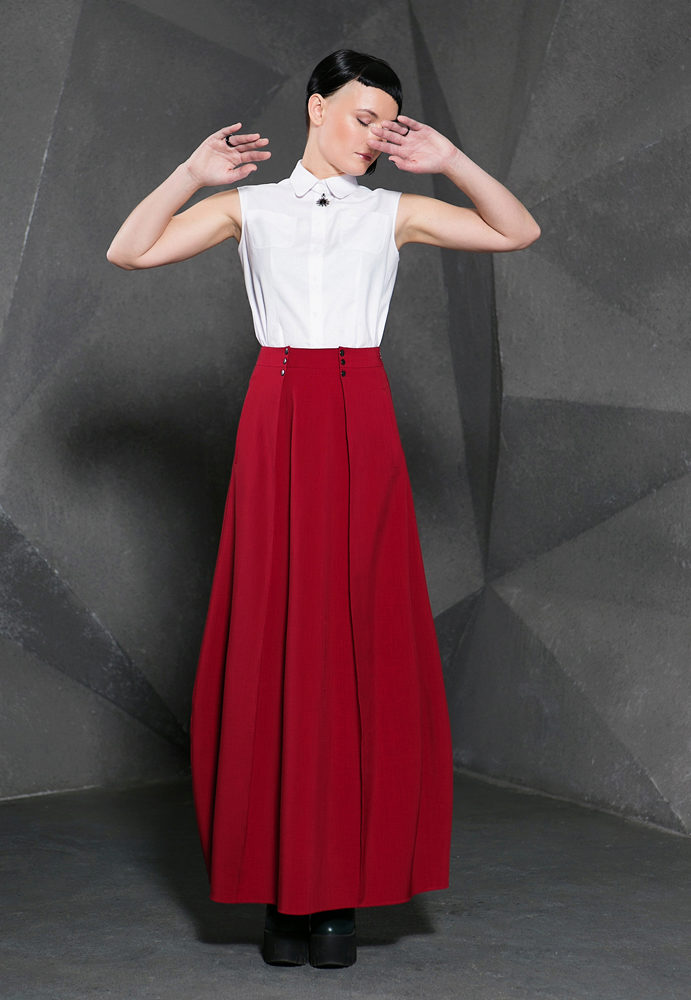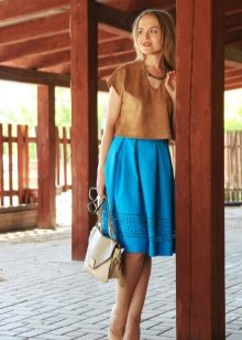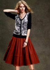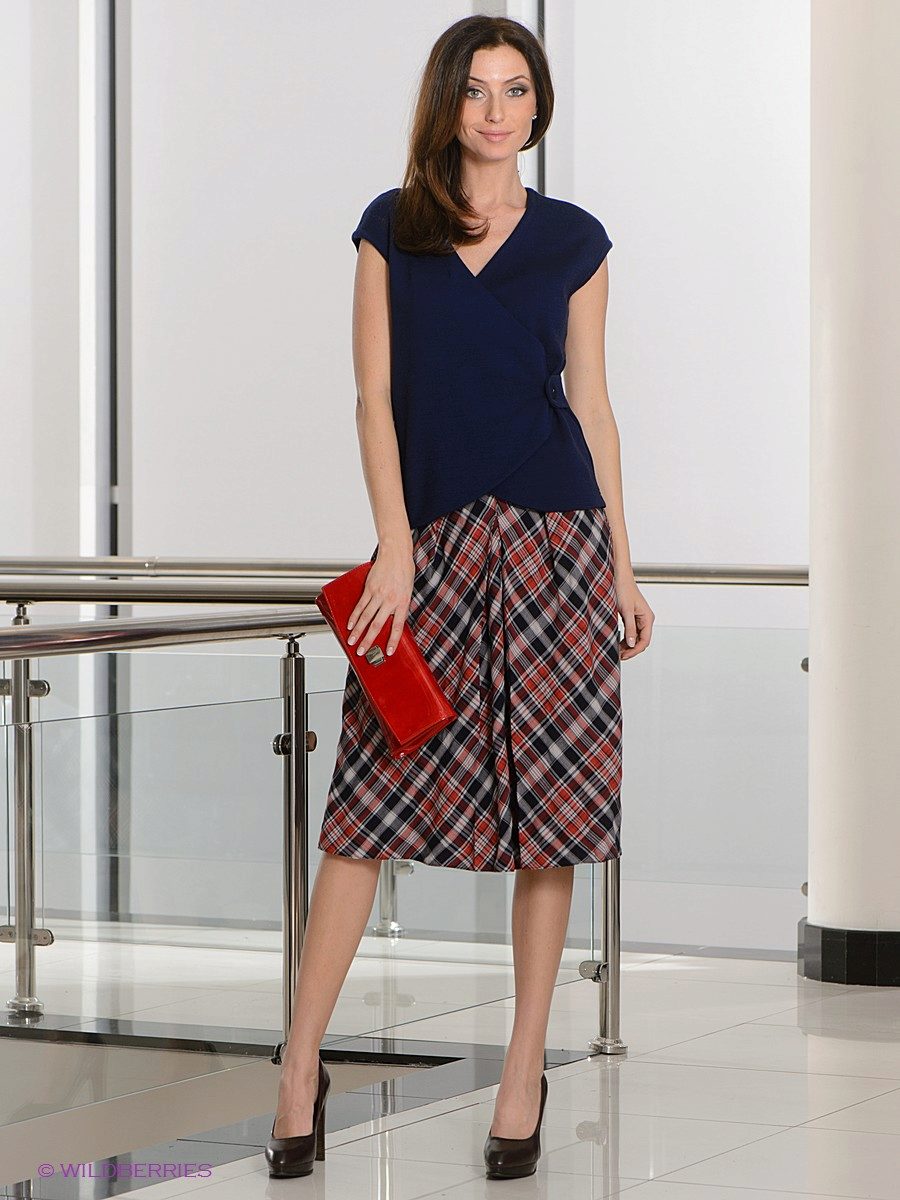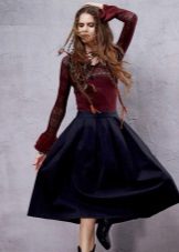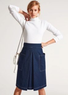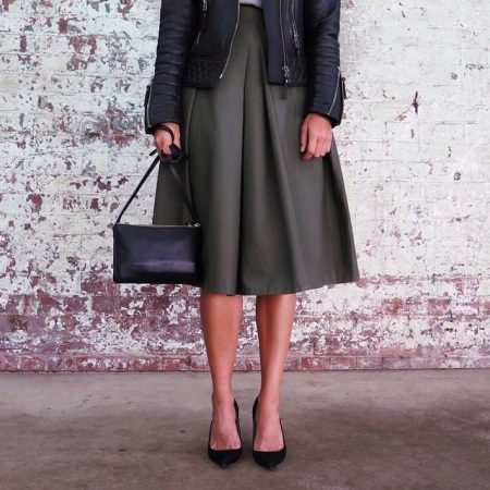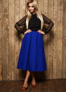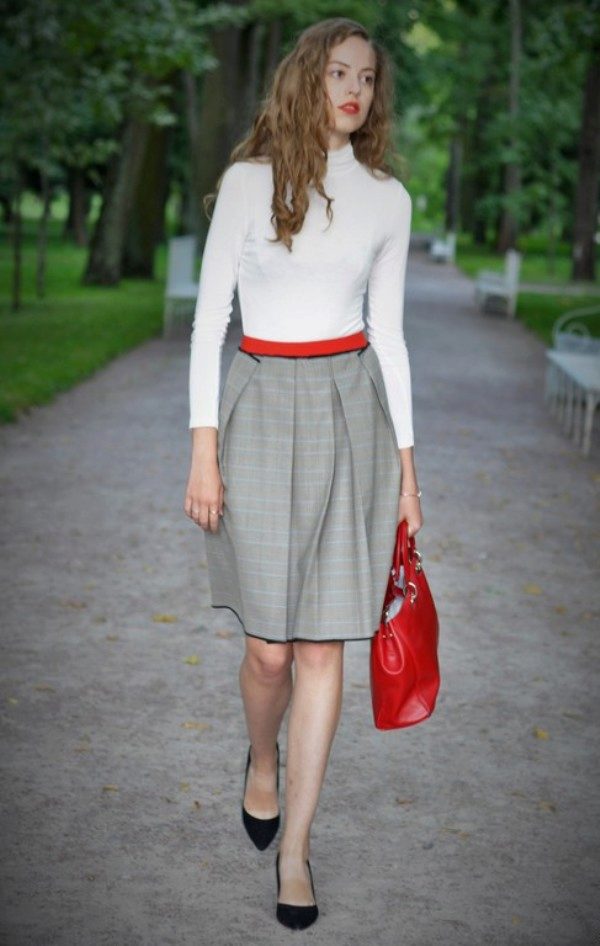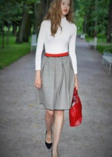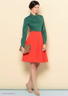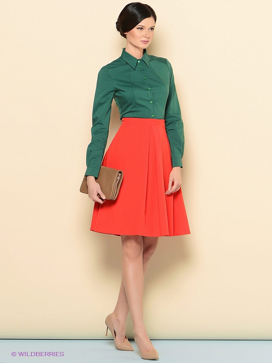 Skirts with colliding folds of thick materials are often worn as part of a business suit. In this case, they are well combined with strict shirts or more informal blouses (depending on the dress code), turtlenecks or jackets.