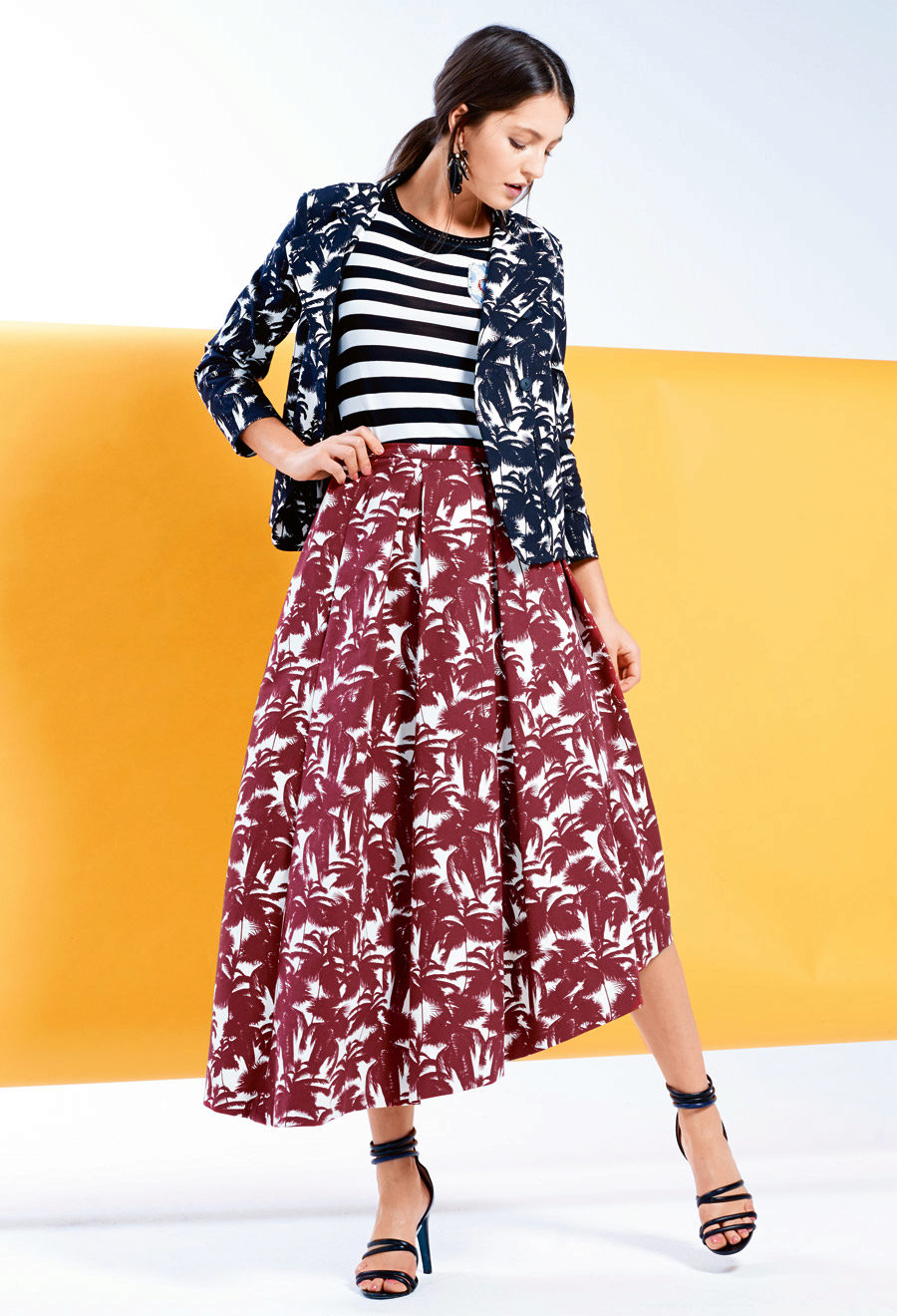 A short denim jacket or denim shirt, knotted at the waist, will also harmoniously fit in here.