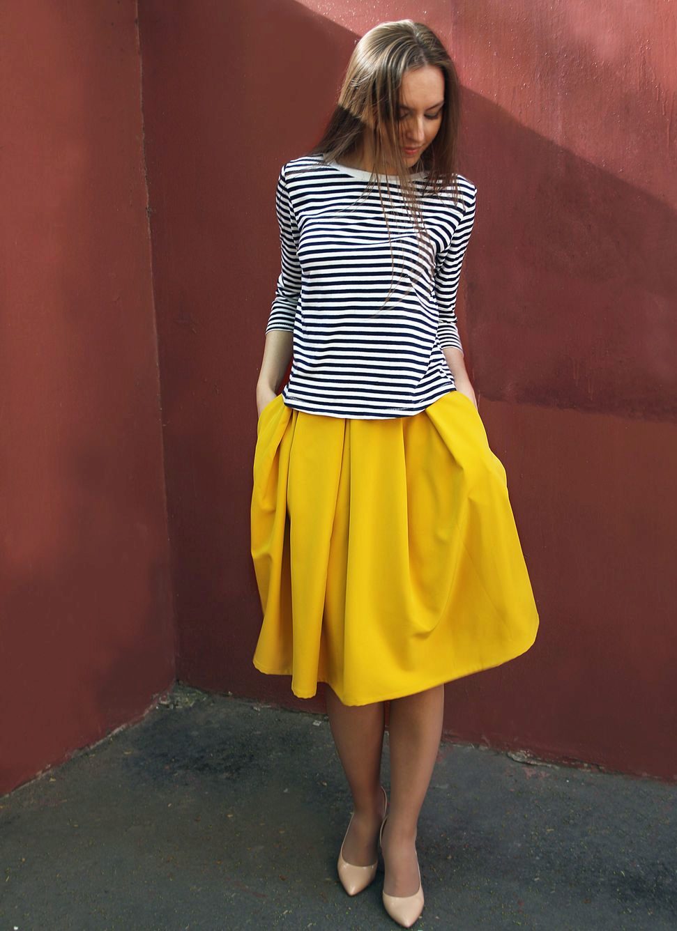 If you have at least minimal knowledge in the field of cutting and sewing, the creation of a skirt with opposite folds will not be a big problem for you. In addition, this model does not need a pattern - all measurements are transferred directly to the fabric.