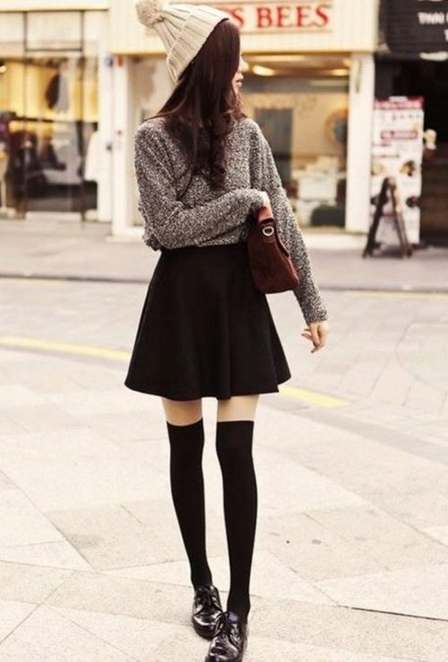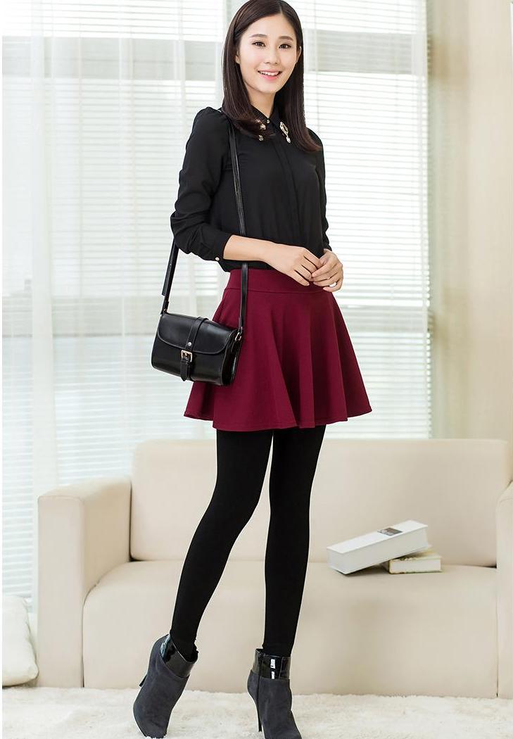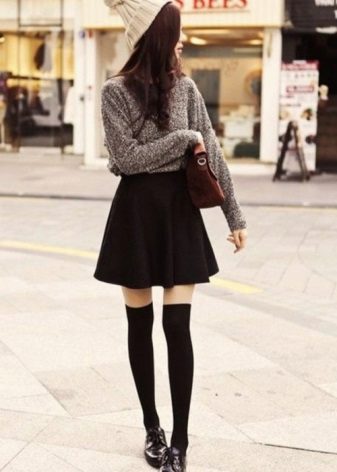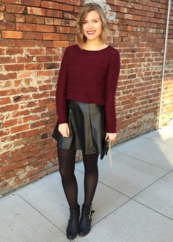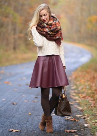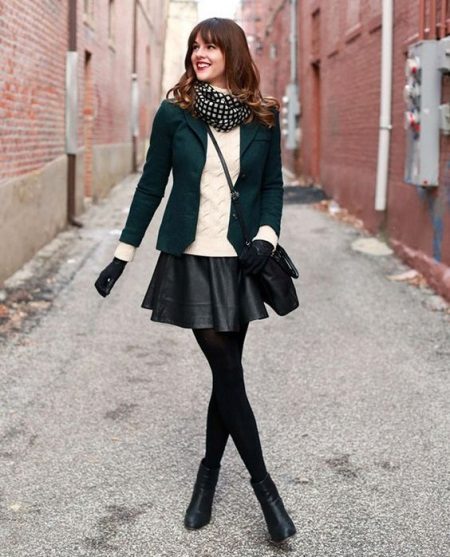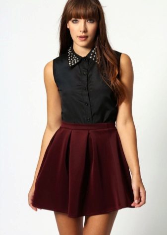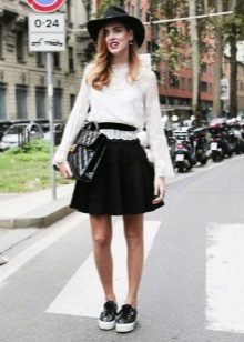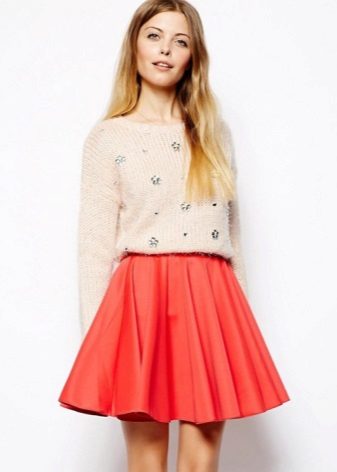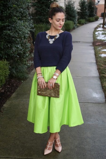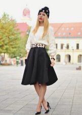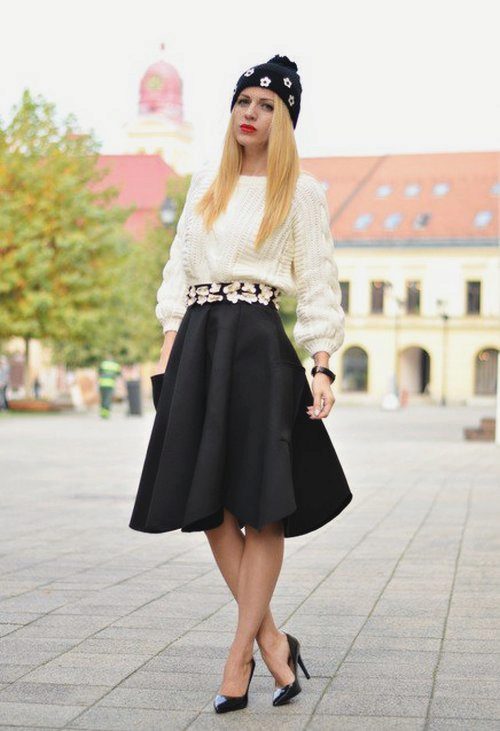 Flared skirts of denser materials are an option for cool weather or for office work. Therefore, they are well combined with concise turtlenecks, strict shirts, jackets, fitted sweaters, vests, etc.