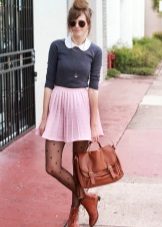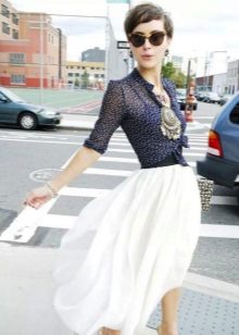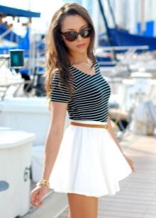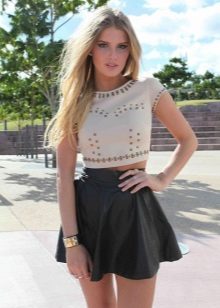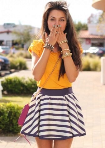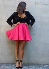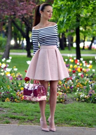 But when choosing an accompaniment to flared skirt, it is necessary to take into account the material of the product. If the skirt is made of thin fabric, a lightweight top, a simple knit shirt, a light shirt or a blouse will suit her. Above you can throw a bolero, denim jacket or cardigan in casual style.
