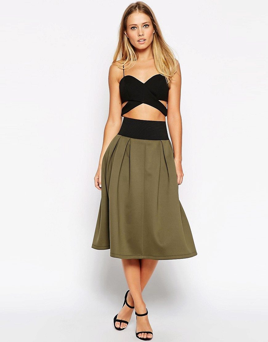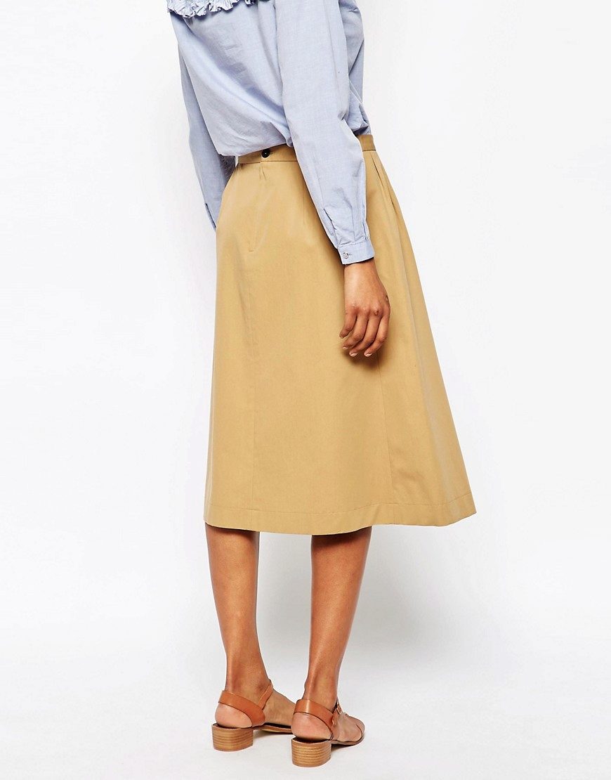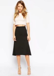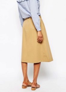 A-line skirt is a fitted model, flared downwards. It can be of different lengths - from mini to maxi, but the length is mostly common - up to the knee or slightly lower. Model A-shaped silhouette - the classic version for everyday use or office. The skirt can be on elastic, on a belt, have a small yoke, be decorated with pleats, buttons, ruffles, etc.