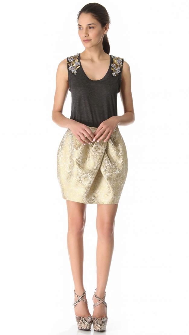 Tulip skirt is characterized by a free form, so women often choose it to adjust the figure. For example, the owners of the T-shaped figure with the help of this style will be able to create a proportional appearance, because this skirt adds volume to the hips.