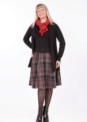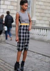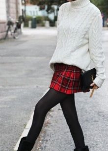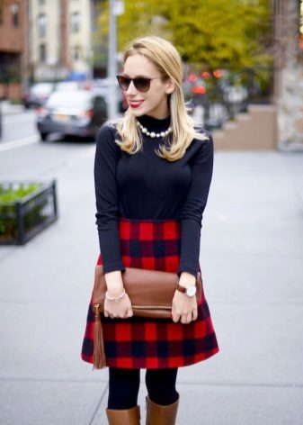 In the cold season, skirts in a cage are perfectly combined with monotonous, dense tights of dark colors. As a shoe you can choose ankle boots or boots with heels.