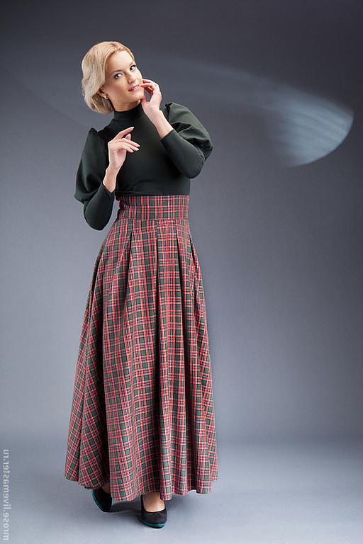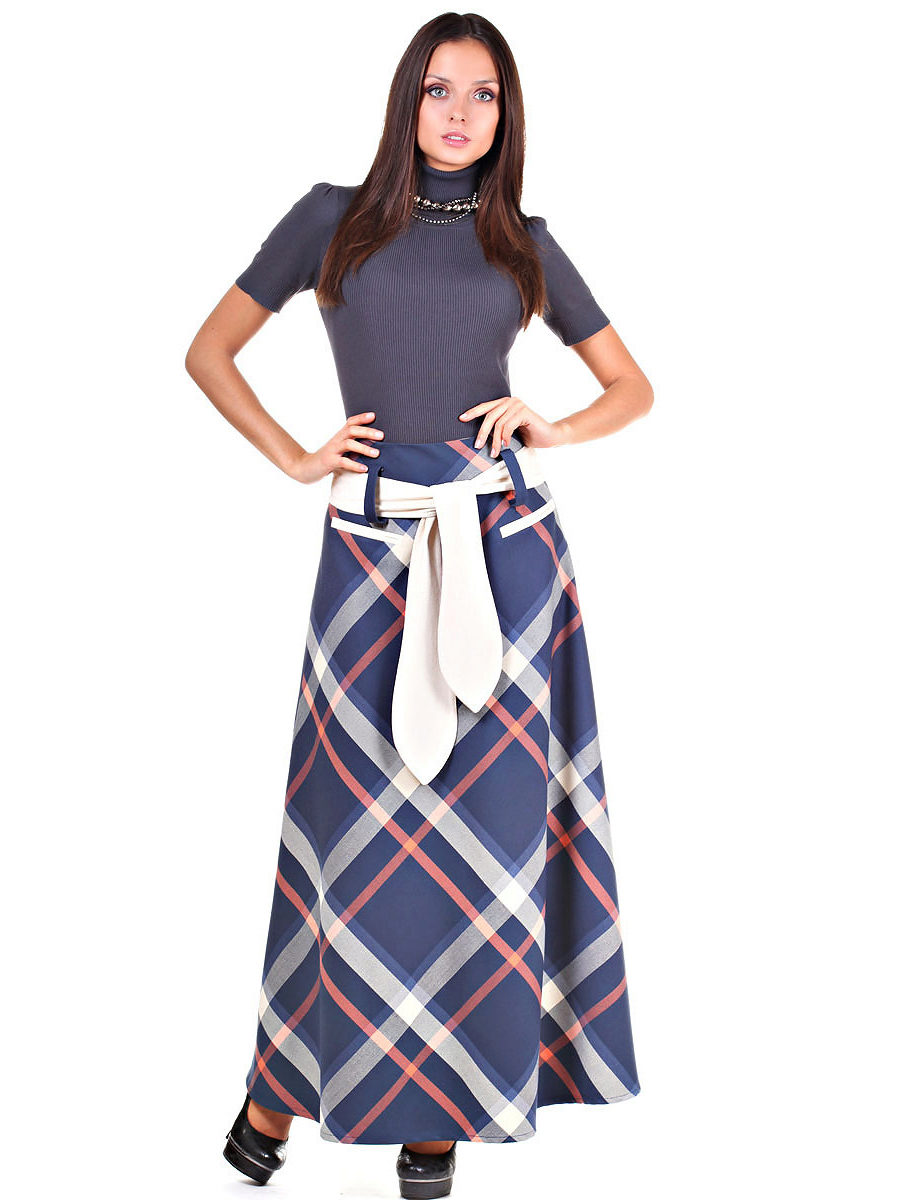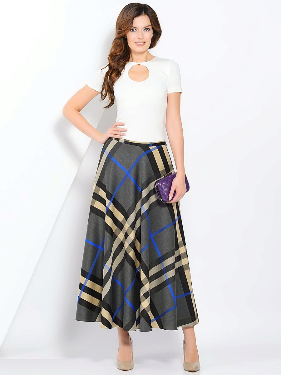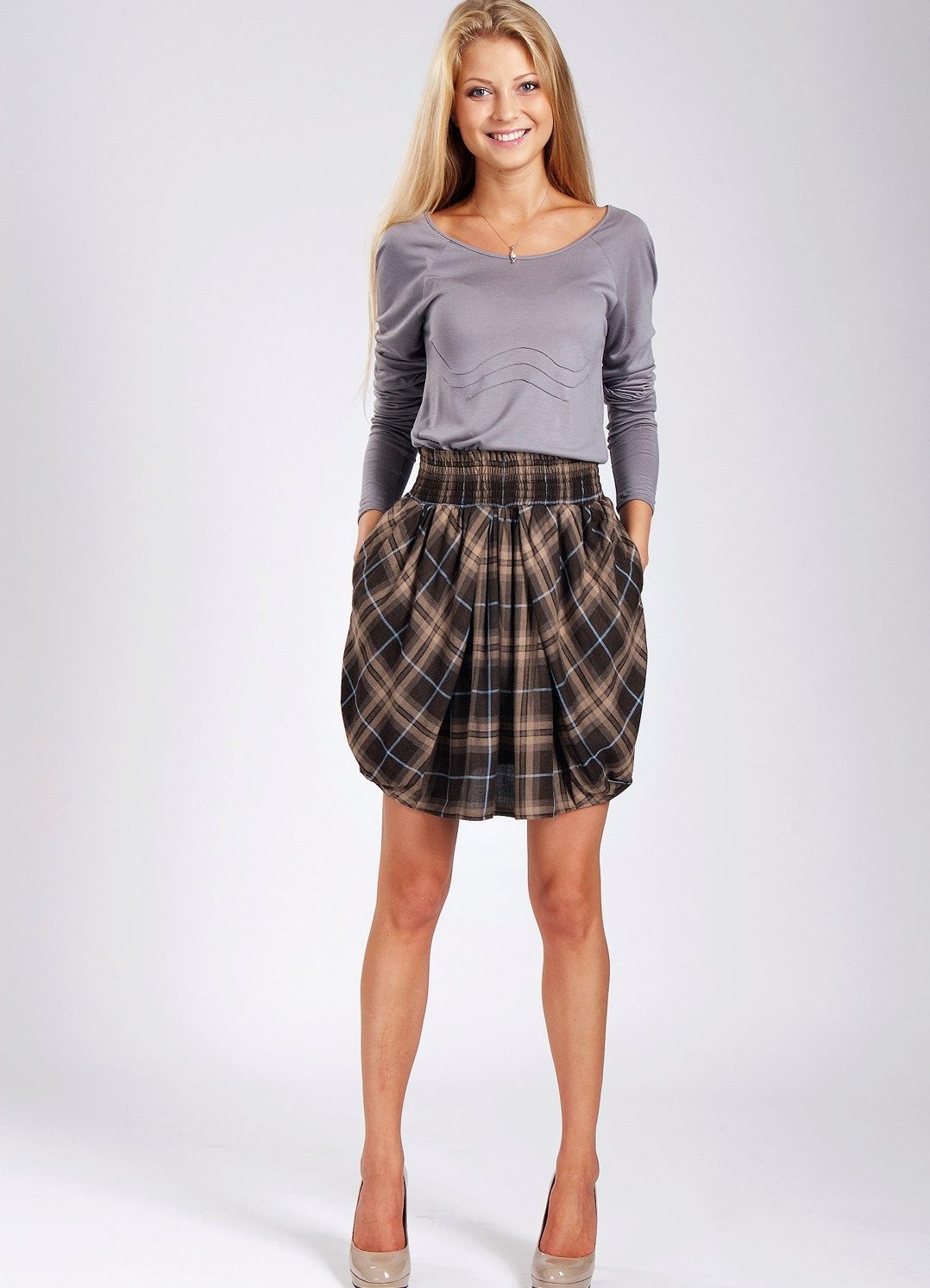 The checkered print looks very nice on a dense fabric that keeps its shape well, so very often such skirts are used in a cool and cold season.