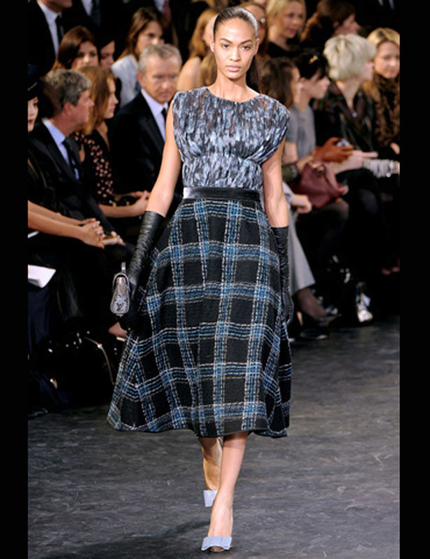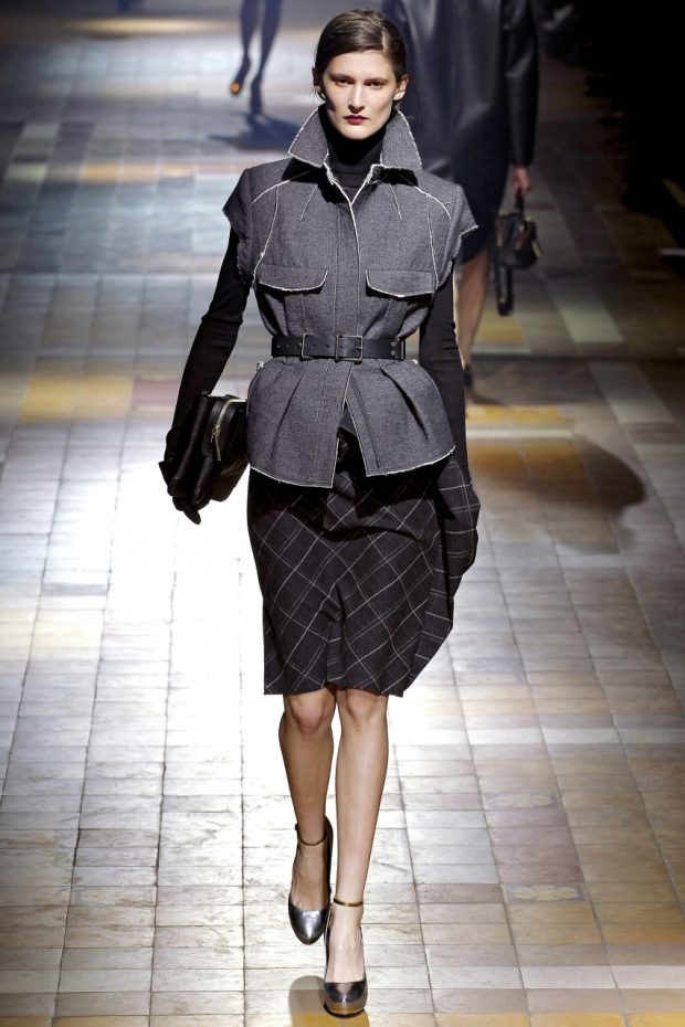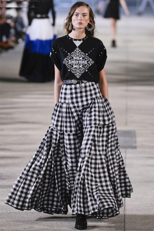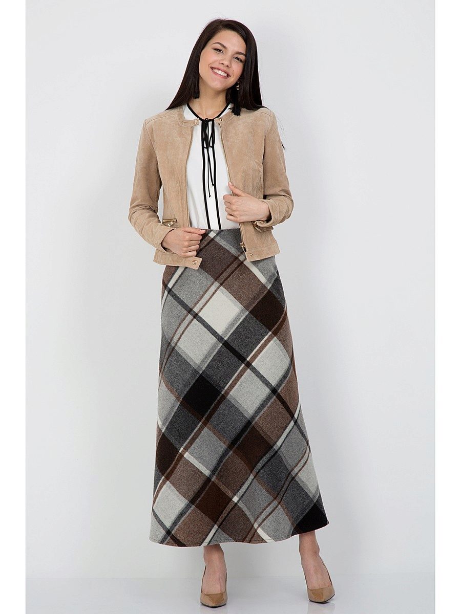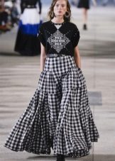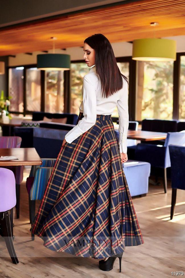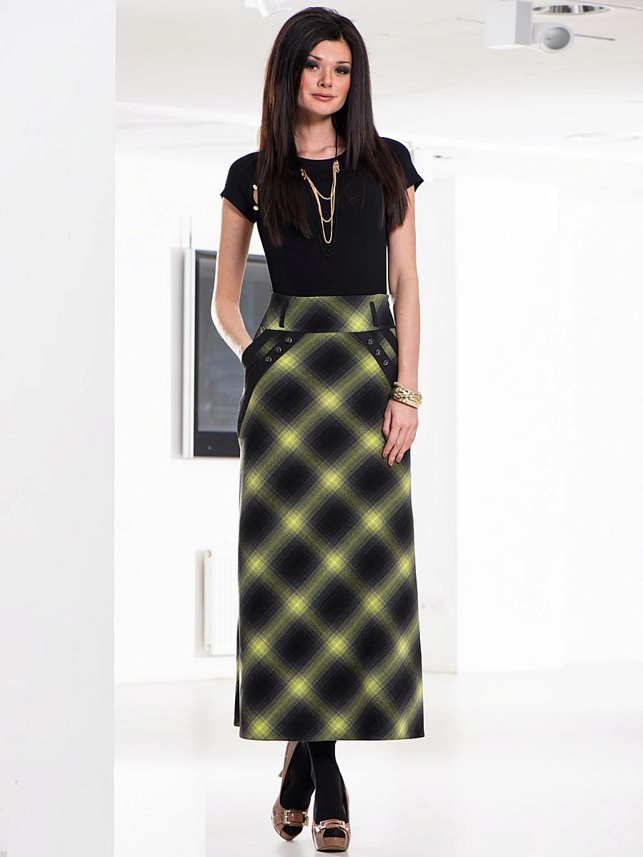 The checkered print looks very nice on a dense fabric that keeps its shape well, so very often such skirts are used in a cool and cold season.