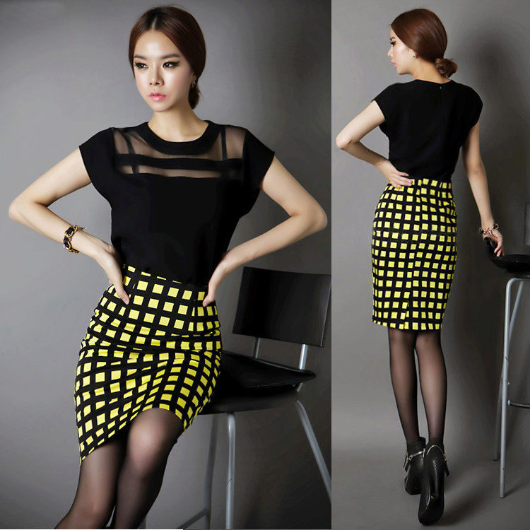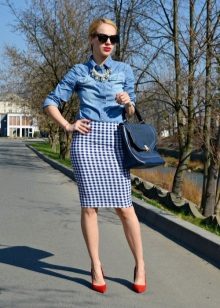 A floor-length pencil skirt can be part of a business suit. Moreover, the cell can be made, as in a dull, classical scale - black, gray, white, or have a more saturated color - red, green, blue. In the case of a bright cell, the top must be selected as simple as possible.