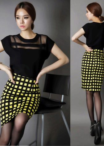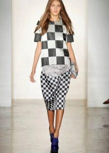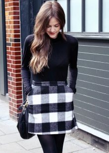 A skirt with a bright, large cage requires a calmer top. This can be a plain turtleneck, top, T-shirt or shirt.