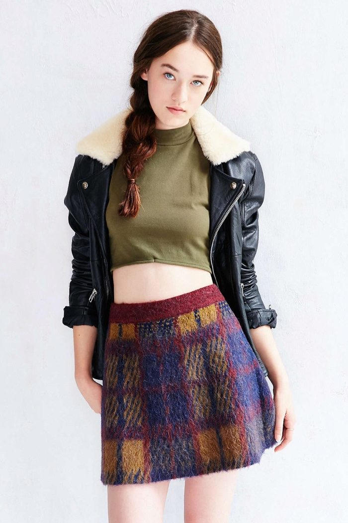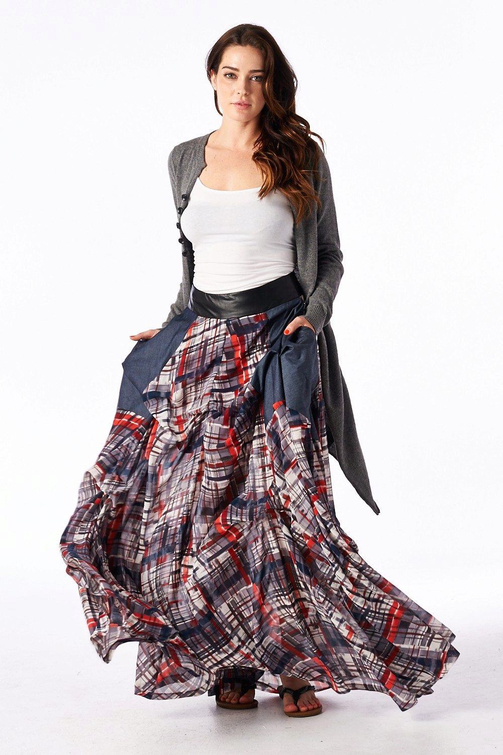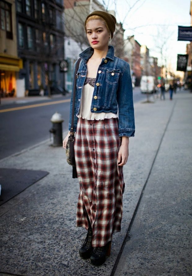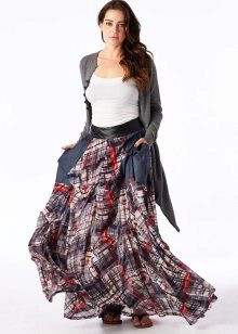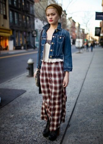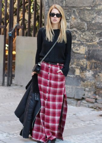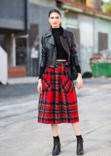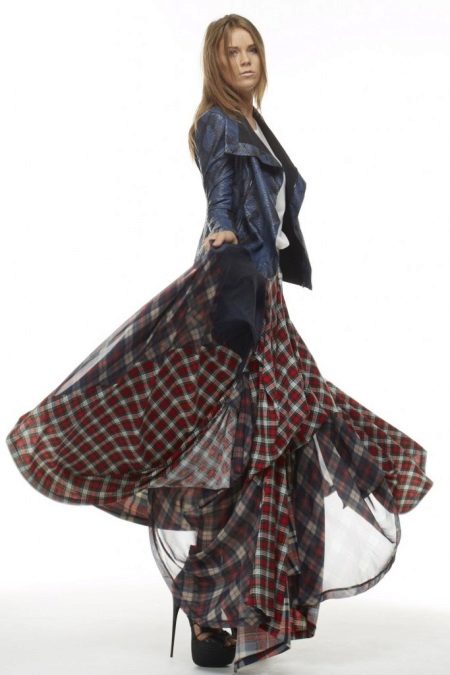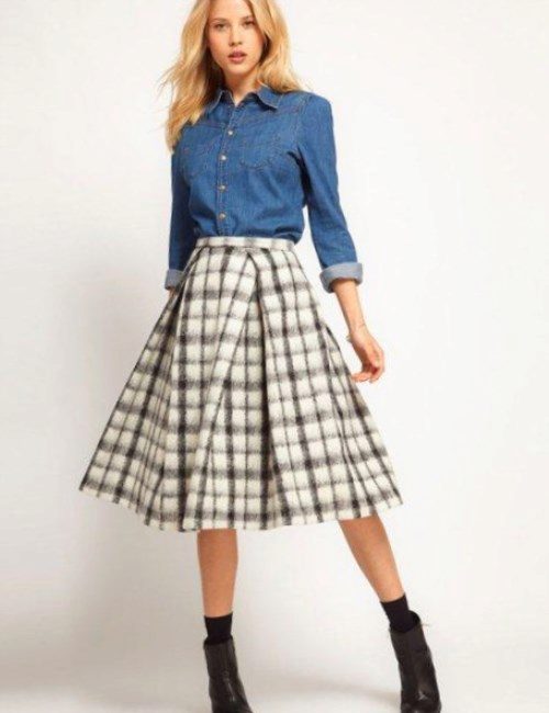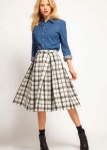 Such a skirt with a cage made in a combination of several colors looks beautiful.This model is perfectly combined with the top, kept in the same color range with the cell. Above you can throw a fitted jacket or denim jacket. Such an image will always look very stylish and modern.