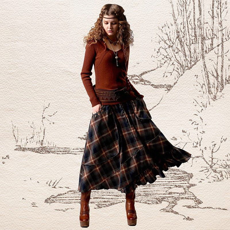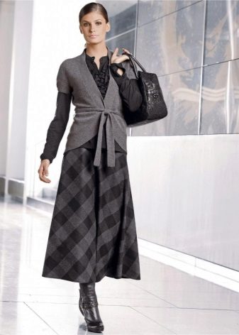A long knitted skirt will make a harmonious ensemble with a plain shirt and a knitted vest or vest.