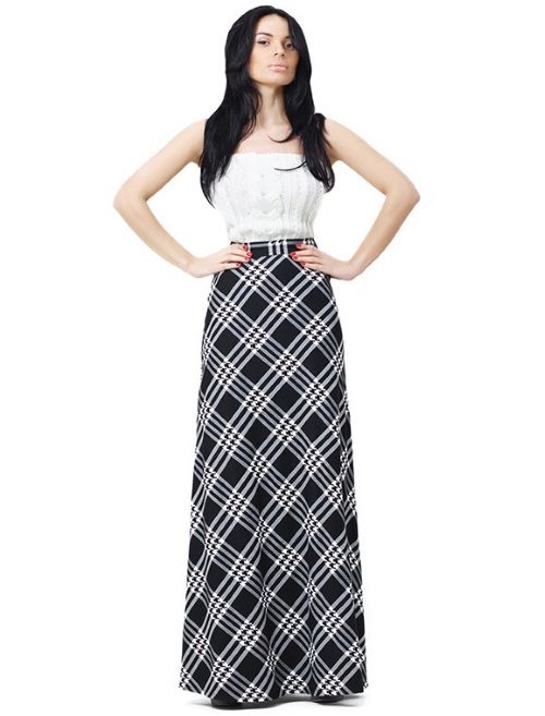 An elegant monochrome blouse in combination with a long checkered skirt made of shiny fabric can make a very interesting and unusual evening dress.