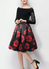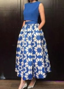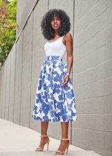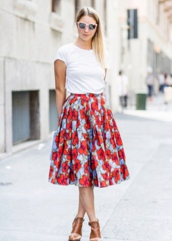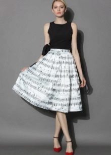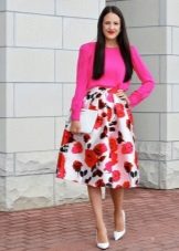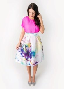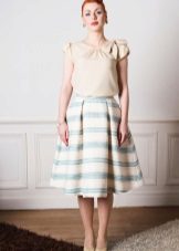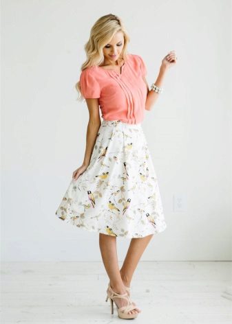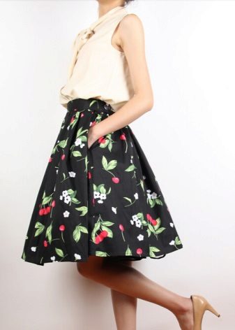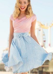 The stylish skirt looks great with a silk blouse. You can pick up on wide straps. Preference is given to blouses bright monochromatic colors, but the skirt can be decorated with a print of contrasting tones. The lacquered belt will become a magnificent addition to the image of the girls-style, and the hair should be decorated with a ribbon, and the color scheme for these decorative elements should be the same.