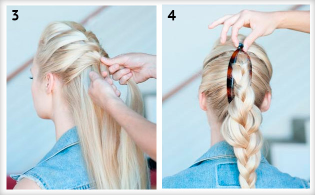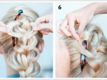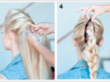 Another attractive option is called the "French Spit". This is a very elegant solution for dating and romantic dates. Making it is also very simple, the first stage is to braid a regular, classic braid. At the very top of the braid attach a hairpin, so that it, like a crab, secured the hair on both sides.