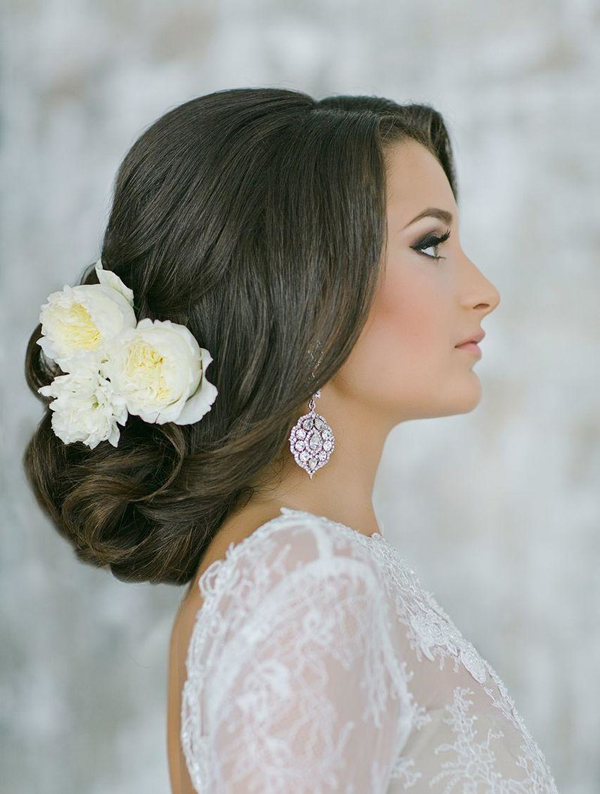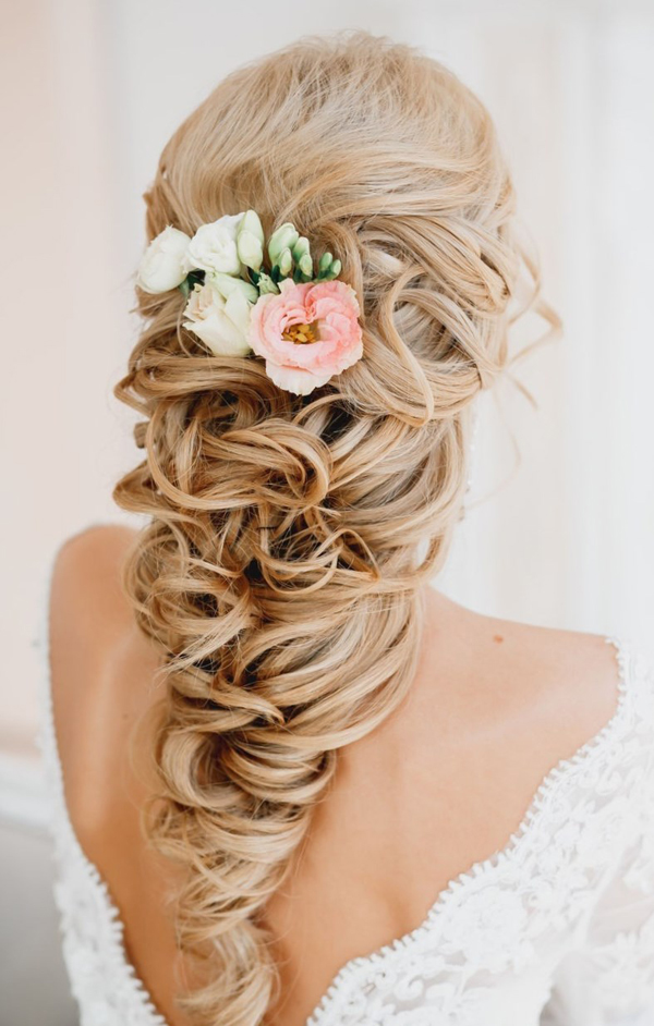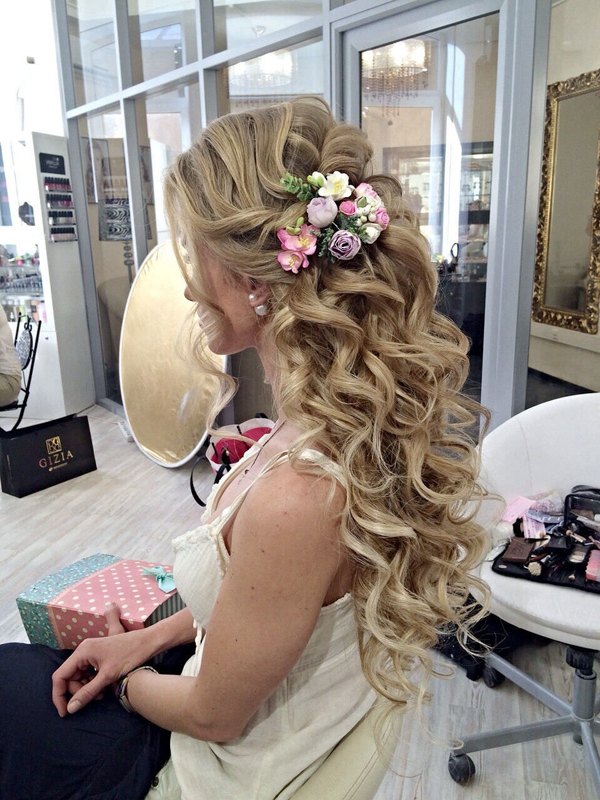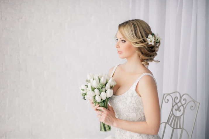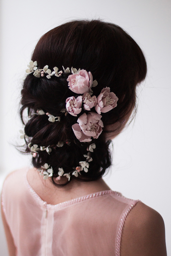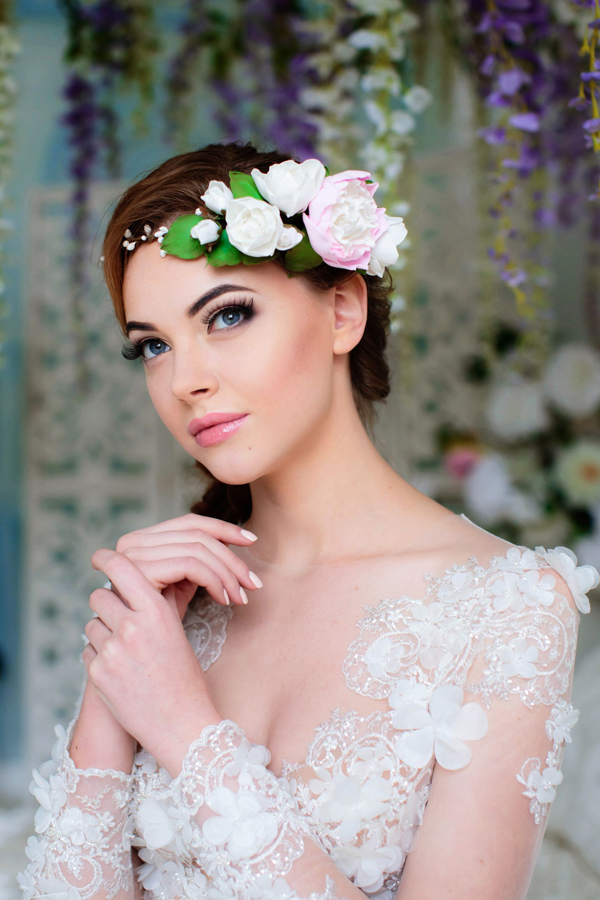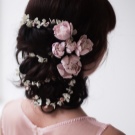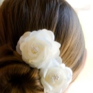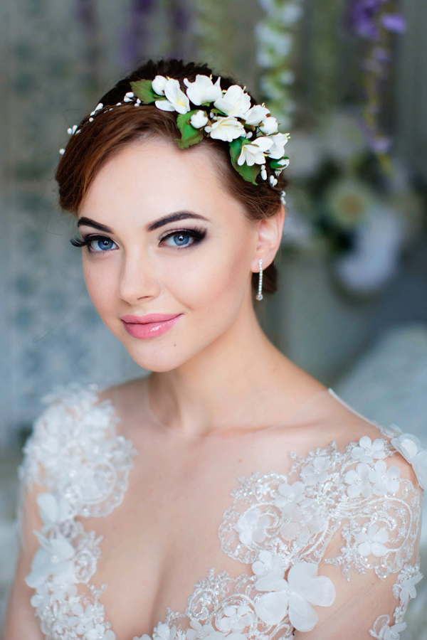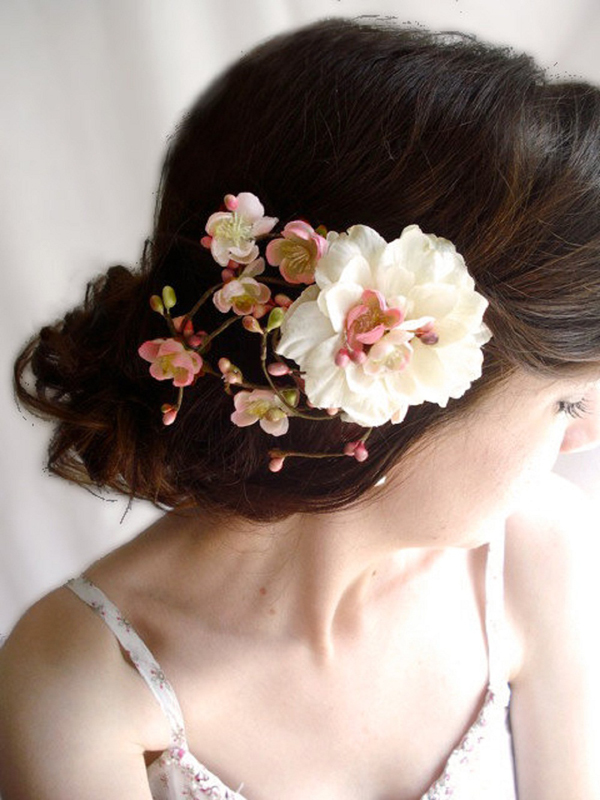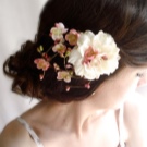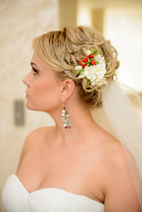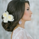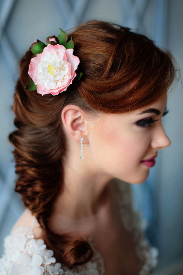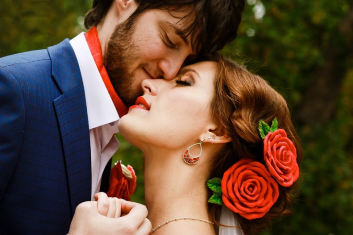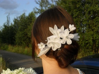 Choosing a hair clip with fresh flowers, the girl risks to be left without a charming jewelry in the midst of the celebration. Flowers tend to wither quickly without water, so this accessory is a good idea to use during a wedding photo shoot. Lilies and orchids in hair decoration will not lose their attractiveness much longer, but the roses in their hair will fade pretty quickly.