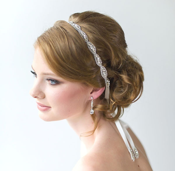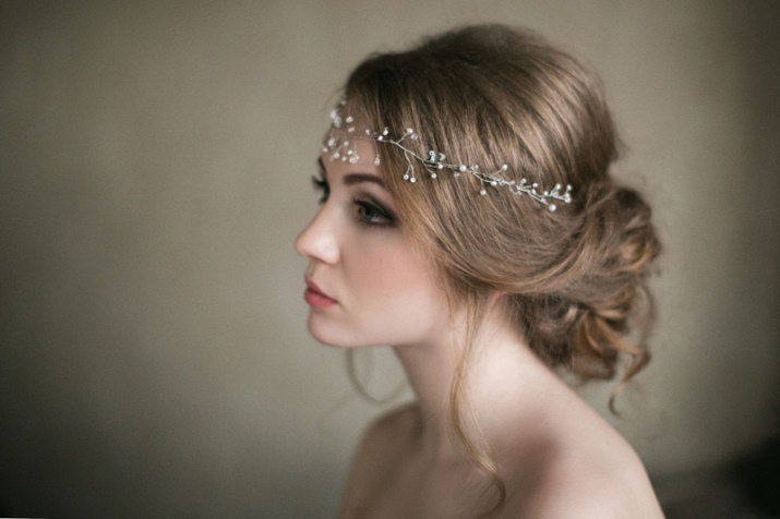 - Wedding hairstyle decoration should match the overall image of the bride. Accessories with feathers or a mesh will suit the retroimage, a tiara can be chosen for the royal look, and the Greek style will not do without a rim.