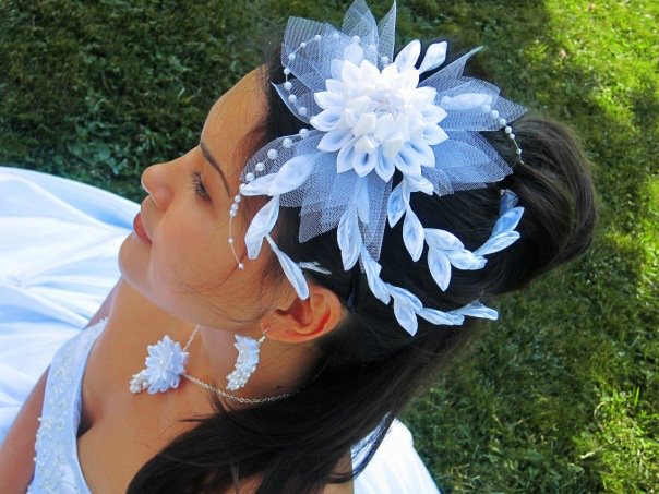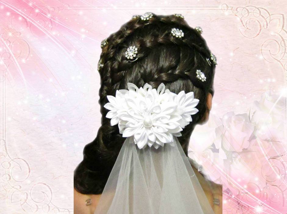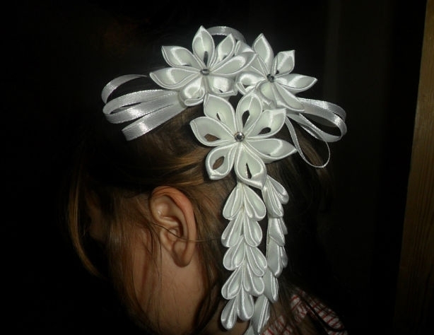 An excellent alternative to the rim can be a wide ribbon, embroidered with beads or rhinestones. The choice of such an unusual accessory will give the image of the bride originality. Also, satin ribbons are widely used to create jewelry using the kanzashi technique, with which you can build an exclusive ornament with flowers.