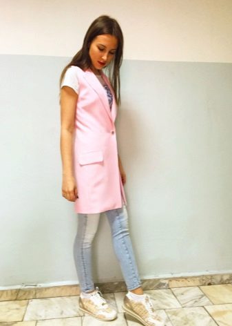 The sleeveless jacket resembles an elongated vest. This is one of the most popular items of clothing, which is absolutely universal. It goes well with both casual and business clothes, it looks stylish and attractive.